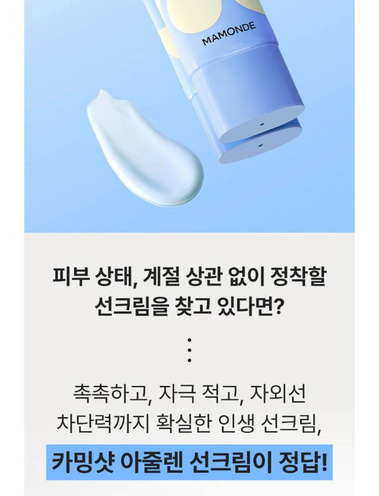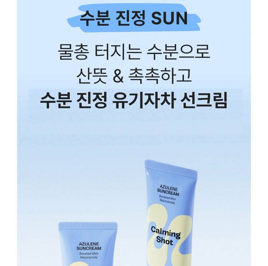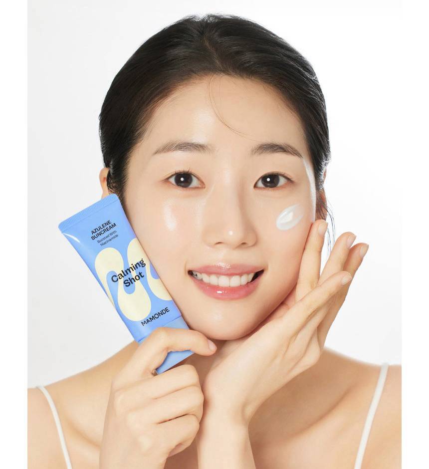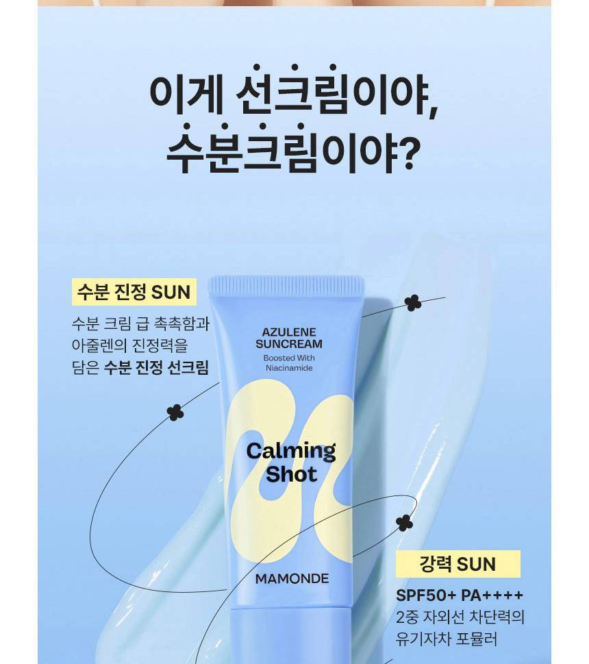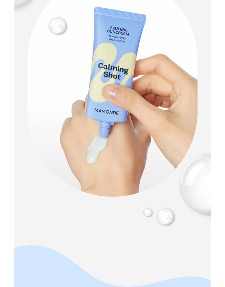 Mamonde Calming Shot Azulene Suncream нь азулен, ниацинамид, гиалуроны хүчилээр баяжуулсан, эмзэг арьсанд тохиромжтой өндөр хамгаалалттай нарны тос юм. Веган, зөөлөн найрлагатай бөгөөд өдөр бүр, нүүрээ будахын өмнө хэрэглэхэд тохиромжтой.