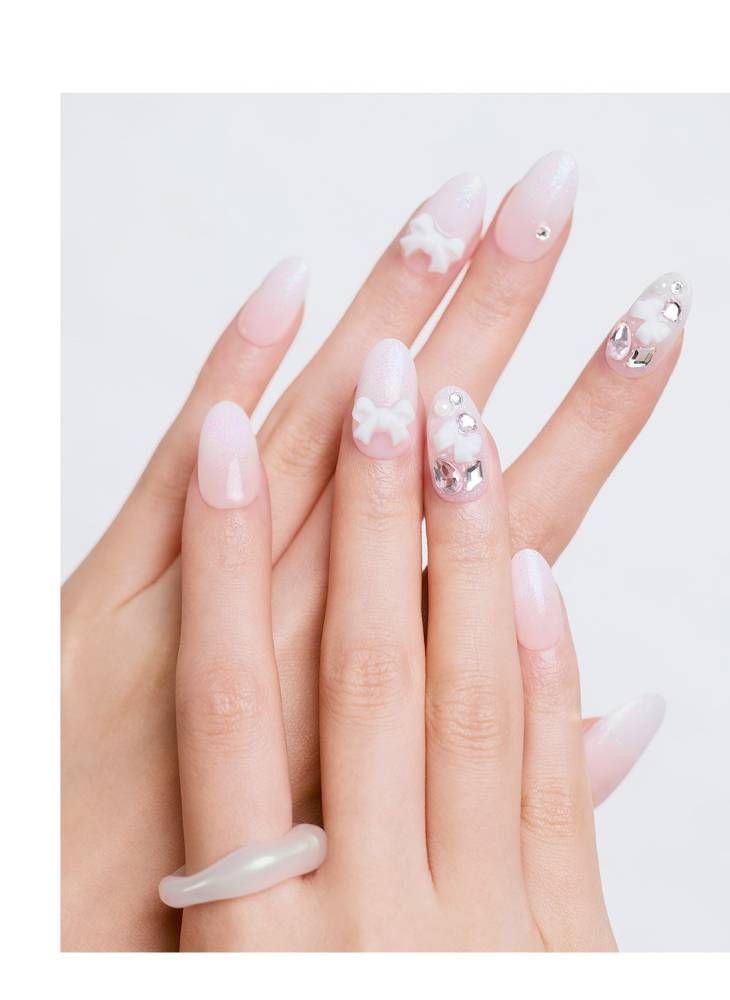 Dashing Diva Magic Press “Mely” Almond нь цагаан, ягаан өнгөний хослол бүхий зөөлөн гялалзсан эффекттэй, алмонд хэлбэртэй наадаг хумс юм. Шигтгээ болон туузан чимэглэлтэй тул тансаг бөгөөд чамин харагдана. Нэмэлт цавуу хэрэглэхгүй, өөр дээрээ наалттай.
