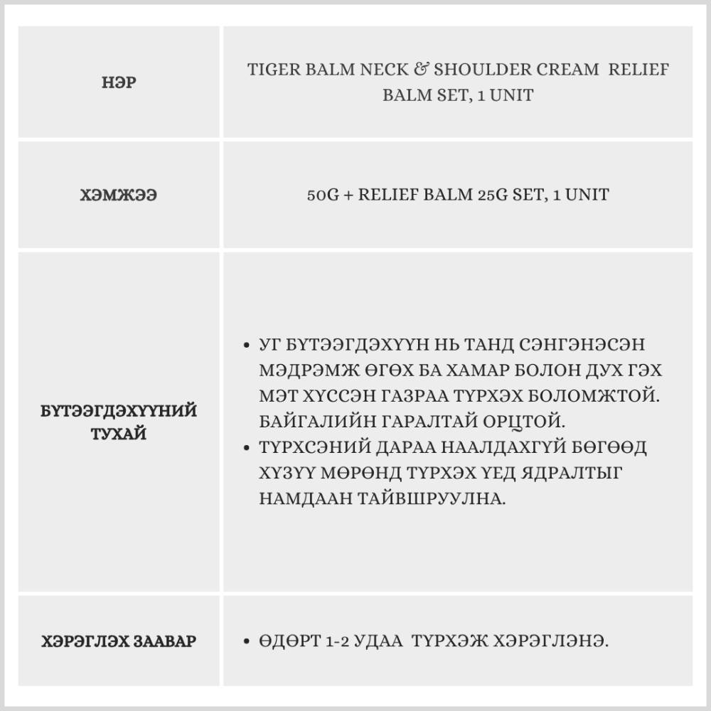 Tiger Balm Neck & Shoulder Cream 50g + Relief Balm 25g Set, 1 unit /Өвдөлт намдаах түхлэг/