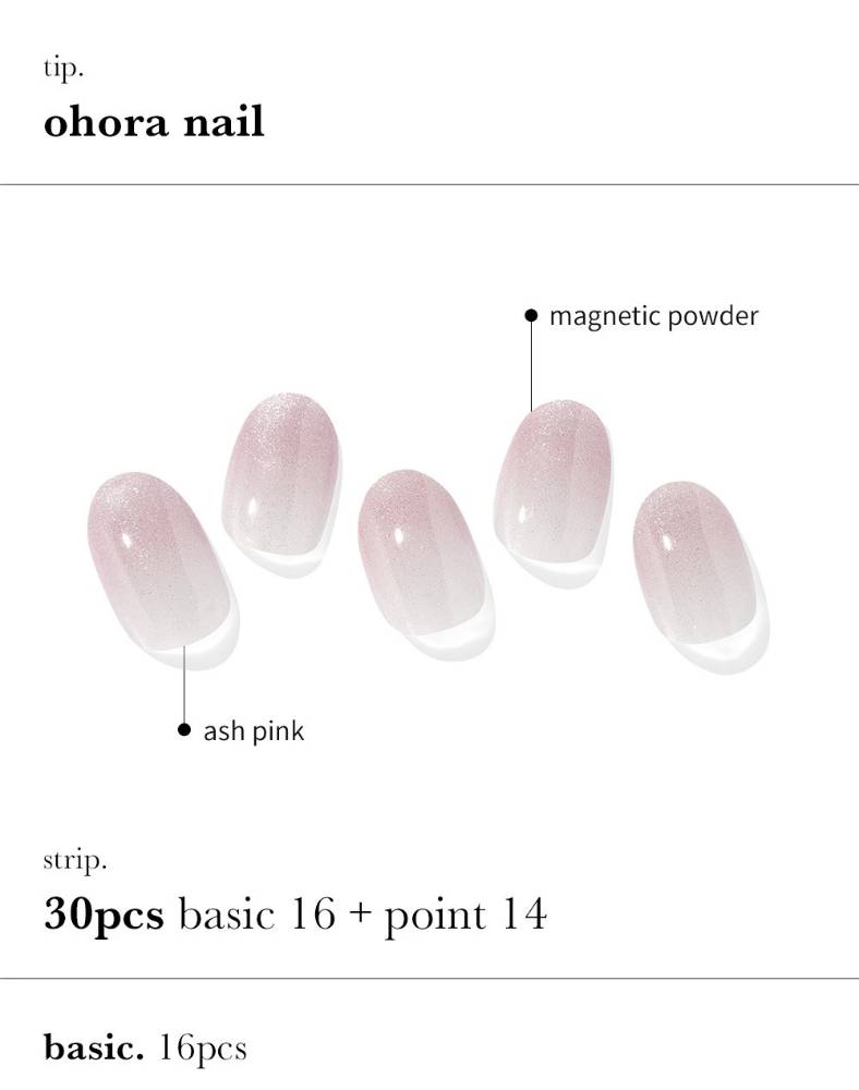 Ohora Nail Strip Set – N Glossiest наадаг стикер бүхий хумс нь наахад хялбар ч гелен материалаар хийгдсэн тул заавал Лед гэрлээр хатаах шаардлагатай. Саарал туяатай бүдэг ягаан өнгөнд соронзон эффект нэмсэн загвартай тул өөрийн хумс шиг цэвэрхэн бөгөөд дэгжин харагдана.