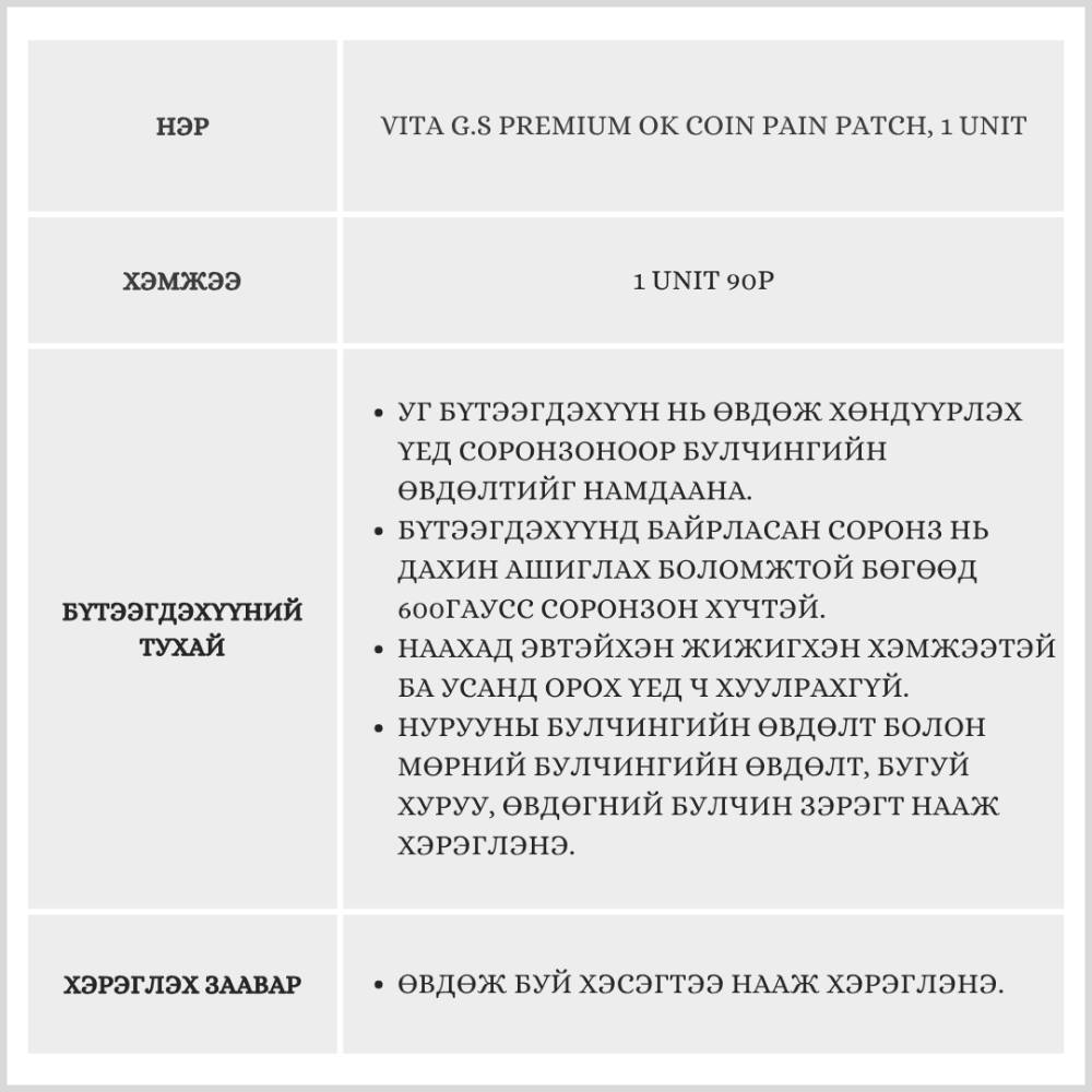 Vita G.S Premium OK Coin Pain Patch, 1 unit /Өвчин намдаах наалт/