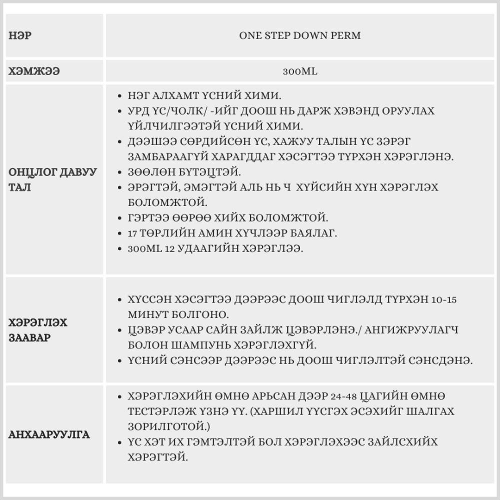 ONE STEP DOWN PERM/ ҮСНИЙ ХИМИ/