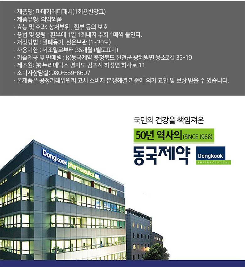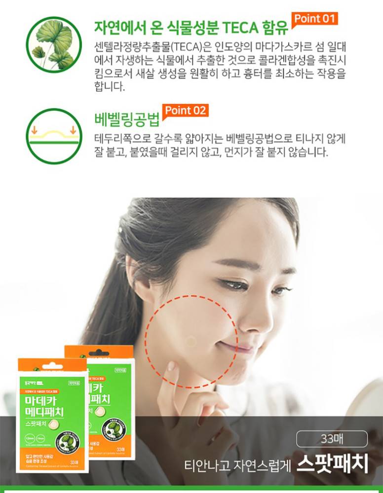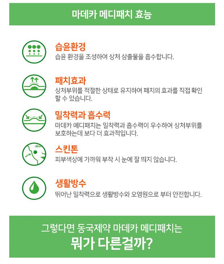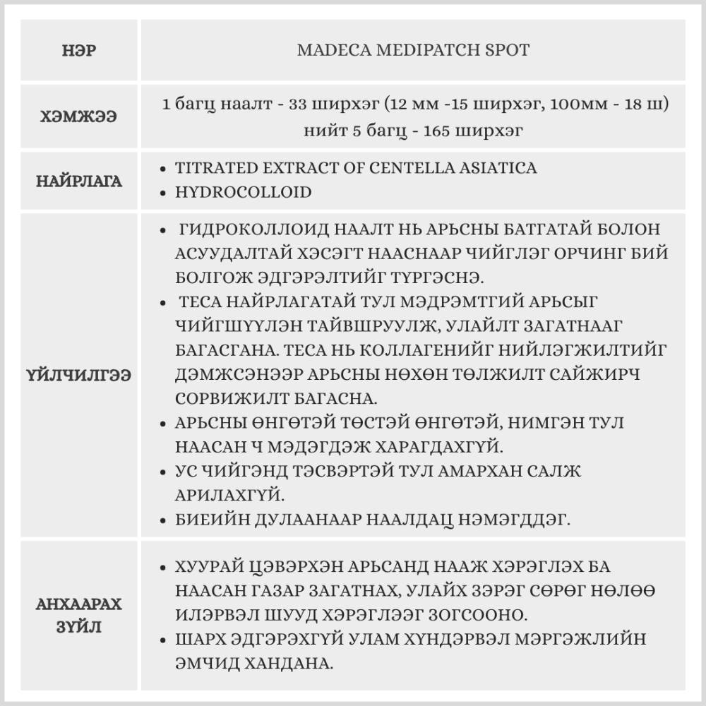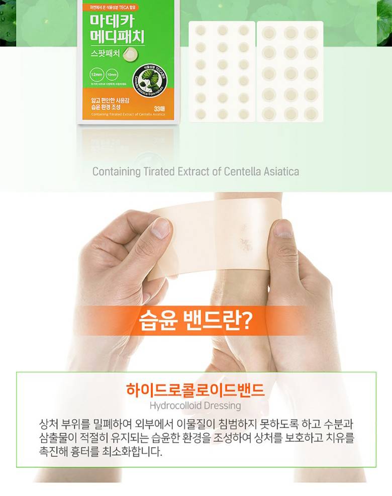Dongkook-ийн Madeca MediPatch Spot батганы наалт нь TECA ханд агуулсан гидроколлоид наалт бөгөөд батга, шарх, жижиг арьсны гэмтлийг хамгаалах, тайвшруулах, эдгэрэлтийг түргэсгэх үйлчилгээтэй. Ус чийгэнд тэсвэртэй ба өдөр тутмын амьдралд хэрэглэх боломжтой.