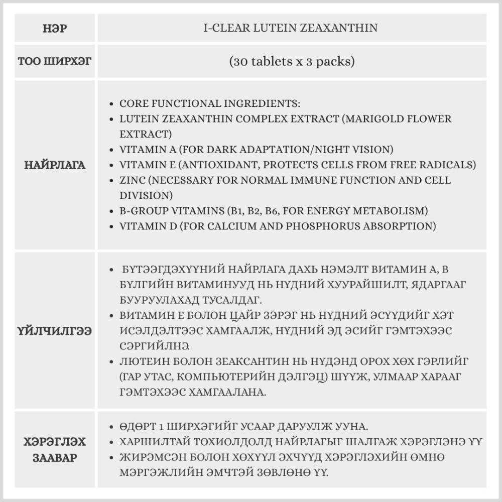 i-Clear Lutein Zeaxanthin 30 tablets x 3 packs(нүдний нэмэлт тэжээл)