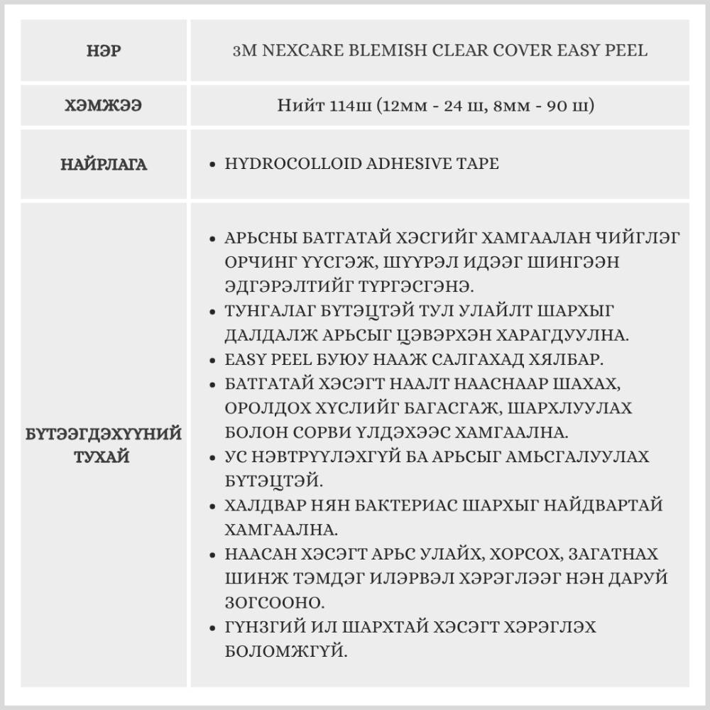3M “Easy Peel” буюу наахад хялбар бүтэцтэй батганы тунгалаг нимгэн наалт. Батга болон тууралттай хэсгийг далдалж, шүүрлийг шингээн хурдан хугацаанд эдгээнэ. Гадны бохирдол болон нян халдвараас найдвартай хамгаална.