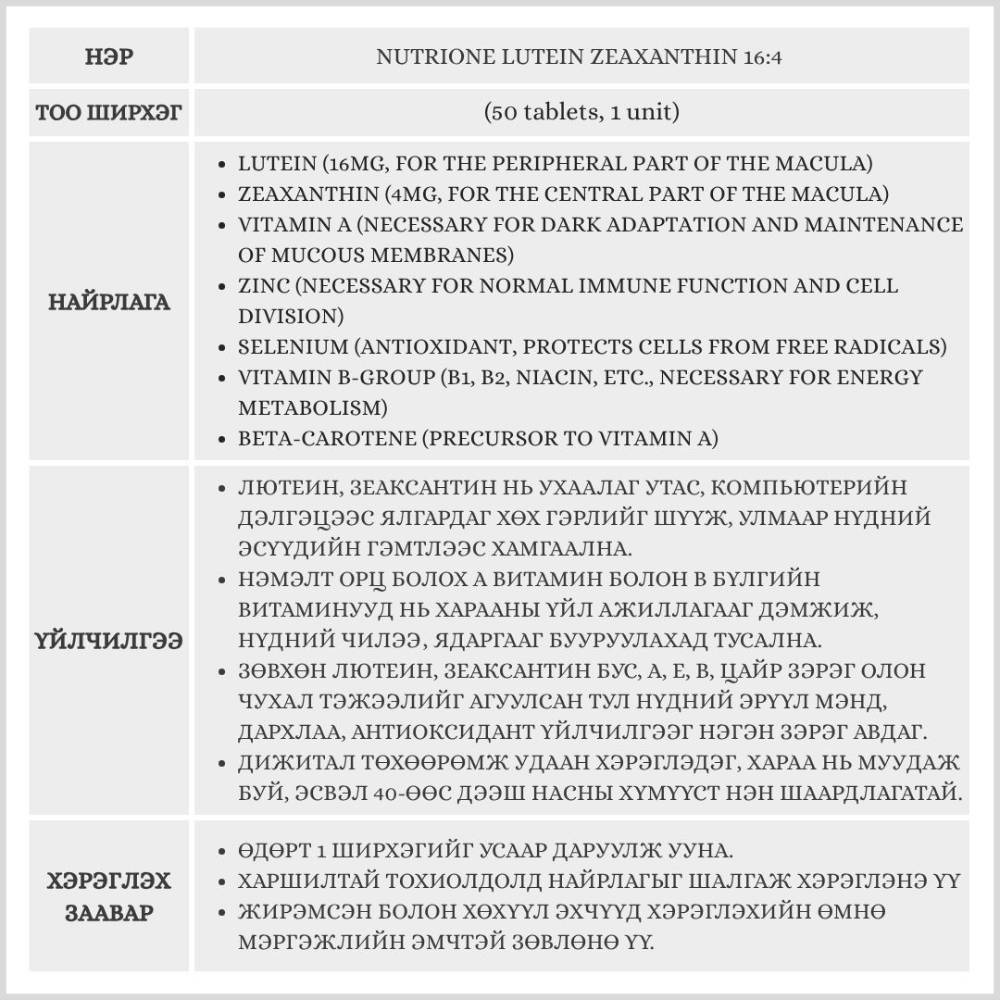 Nutrione Lutein Zeaxanthin 16:4 50 tablets, 1 unit (нүдний нэмэлт тэжээл)