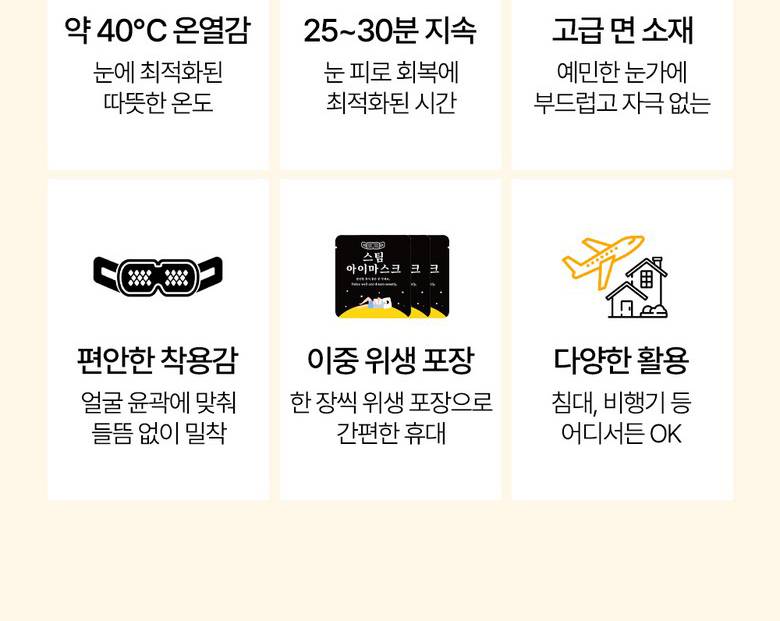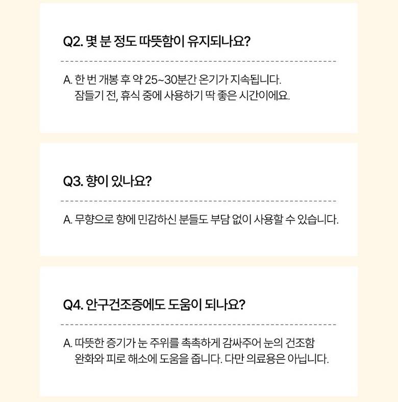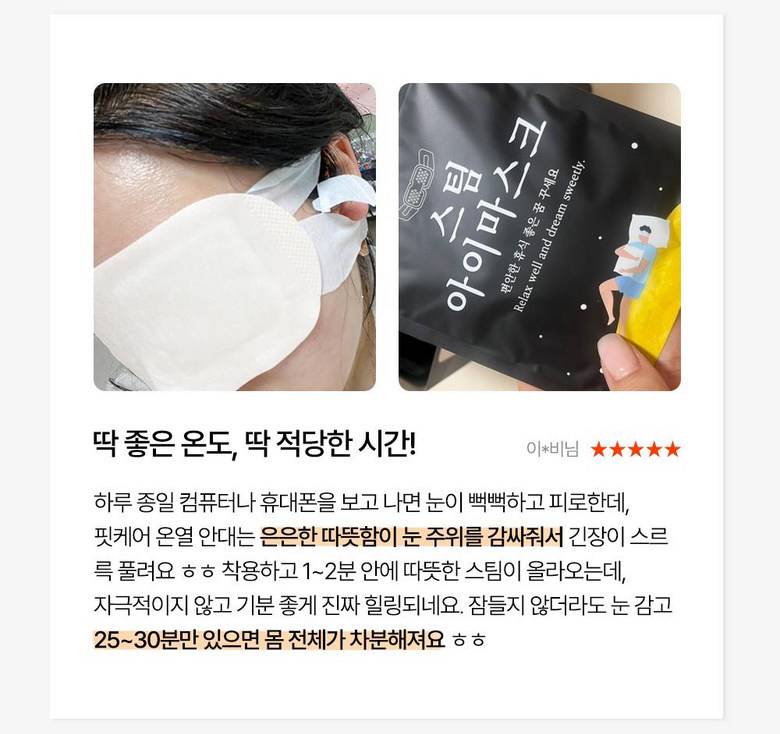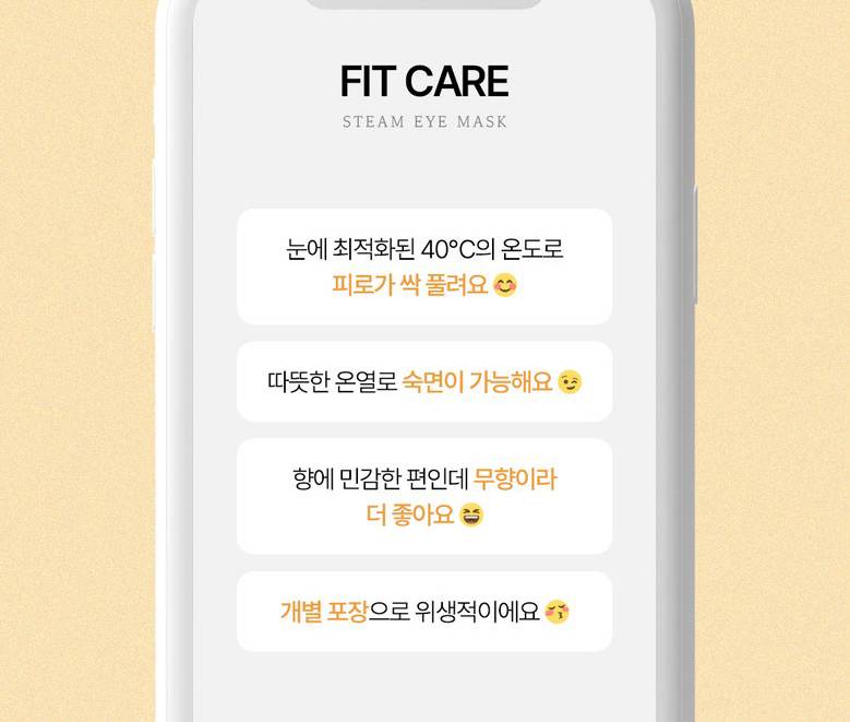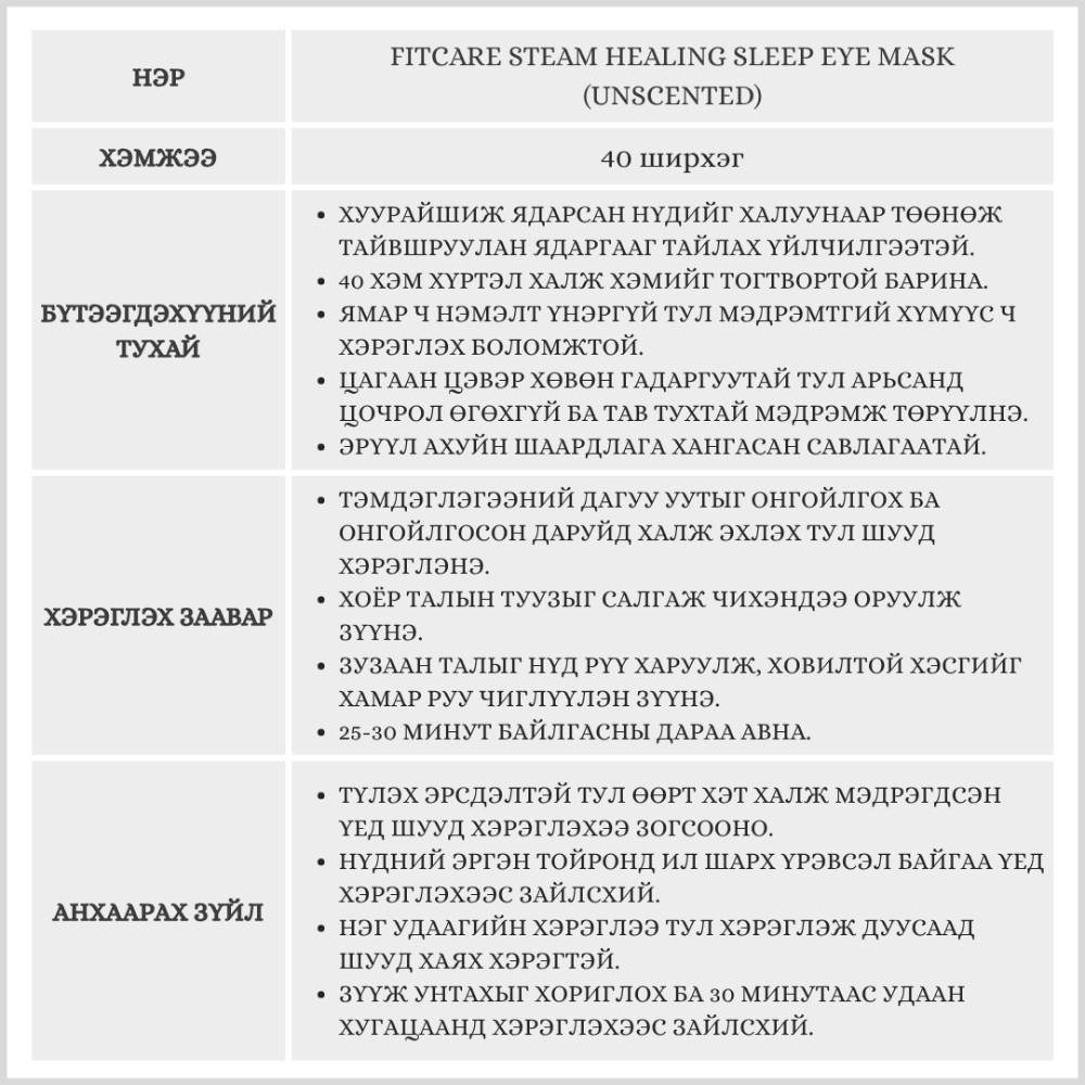 FitCare Steam Healing Sleep халдаг нүдний маск нь нүд болон нүдний эргэн тойрны арьсыг халуун уураар тайвшруулан ядаргааг тайлах үйлчилгээтэй. Ямар ч үнэргүй тул мэдрэмтгий хүмүүс ч хэрэглэхэд тохиромжтой ба арьсанд цочрол өгөхгүй аюул багатай.
