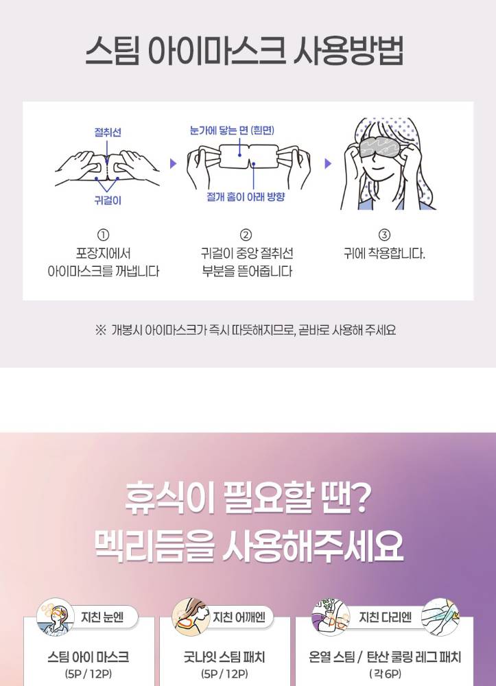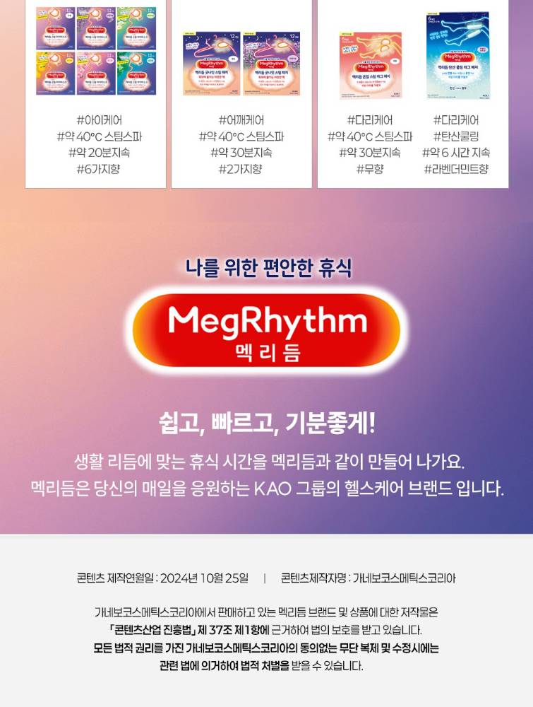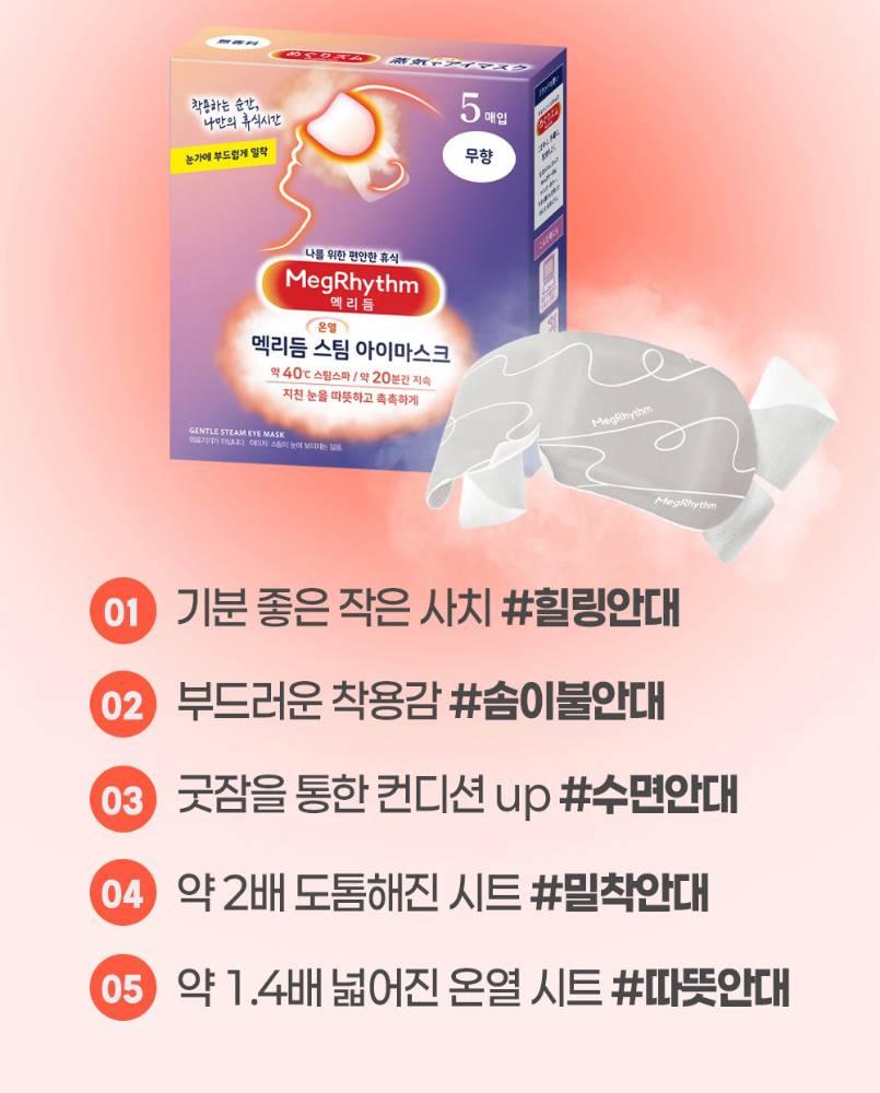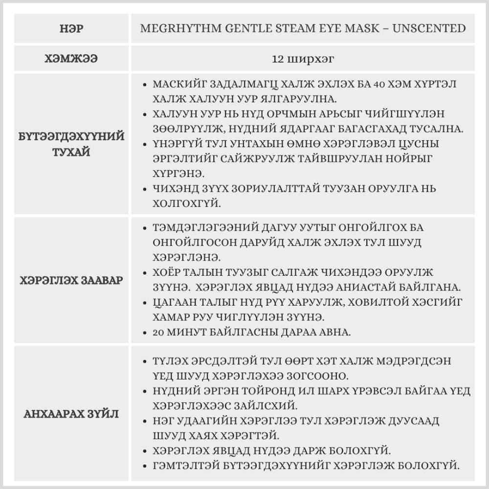 MegRhythm нүдний маск нь ямар ч үнэргүй, 40 хэмийн халуун уураар нүдний ядаргааг тайлж, чийгшүүлэх үйлчилгээтэй бүтээгдэхүүн юм. Унтахын өмнө хэрэглэхэд тохиромжтой ба эрүүл ахуйн шаардлага хангасан ширхэгийн савлагаатай.
