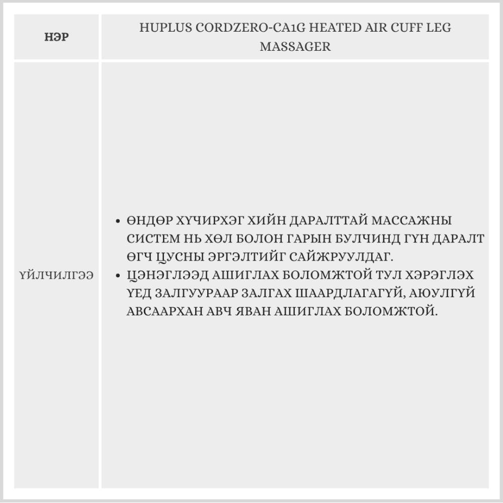 HUPLUS CORDZERO‑CA1G HEATED AIR CUFF LEG MASSAGER / ХӨЛИЙН МАССАЖНЫ ТӨХӨӨРӨМЖ /