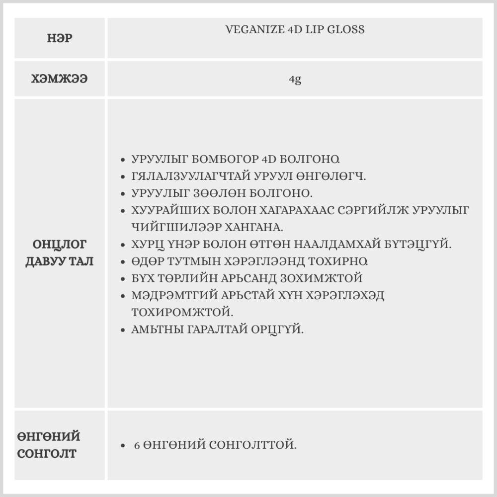 VEGANIZE 4D LIP GLOSS/ УРУУЛ ӨНГӨЛӨГЧ /