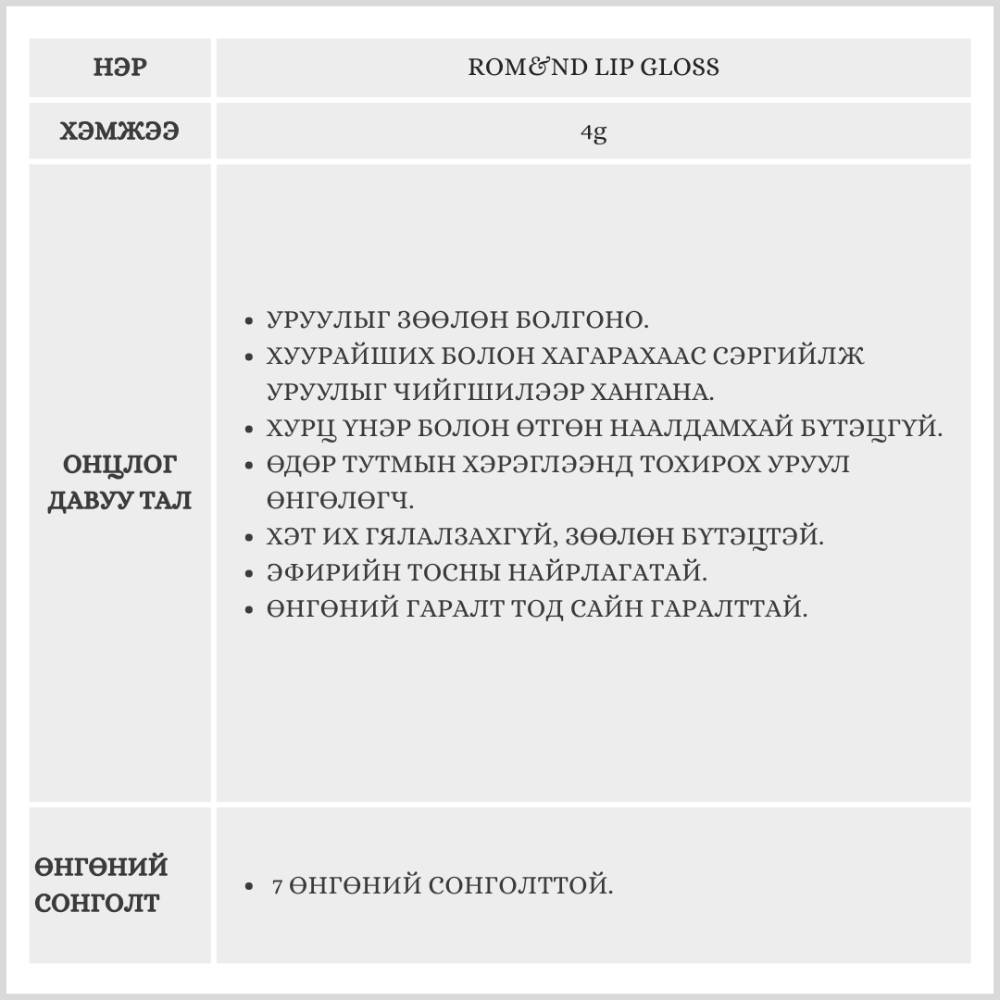 ROM&ND LIP GLOSS /УРУУЛ ӨНГӨЛӨГЧ /