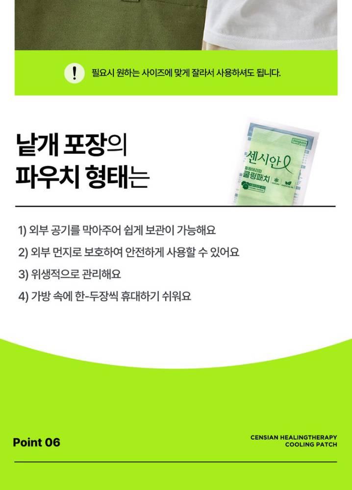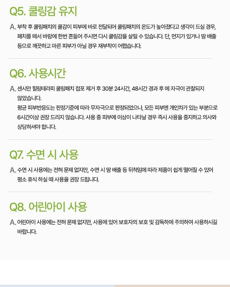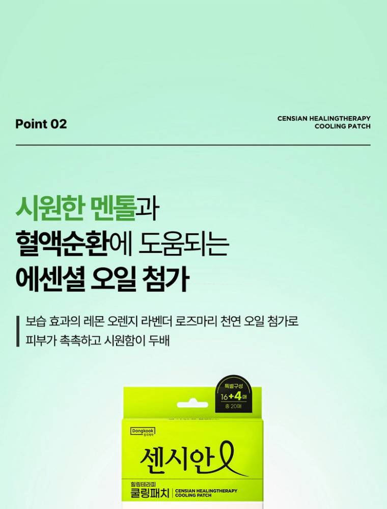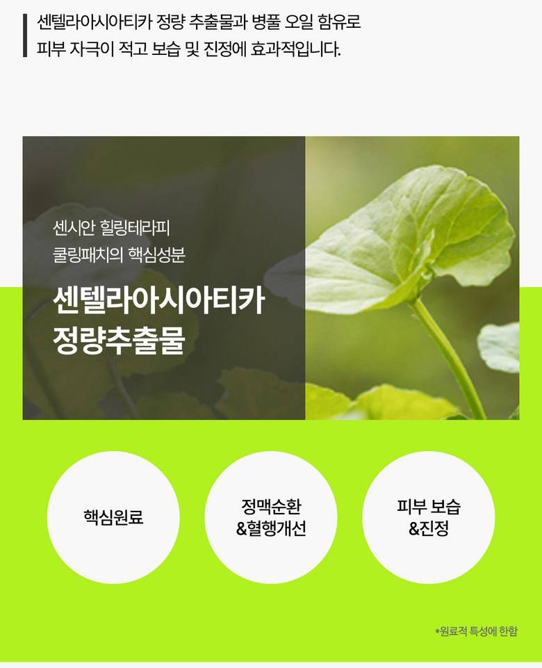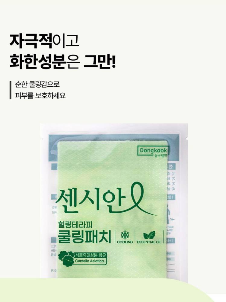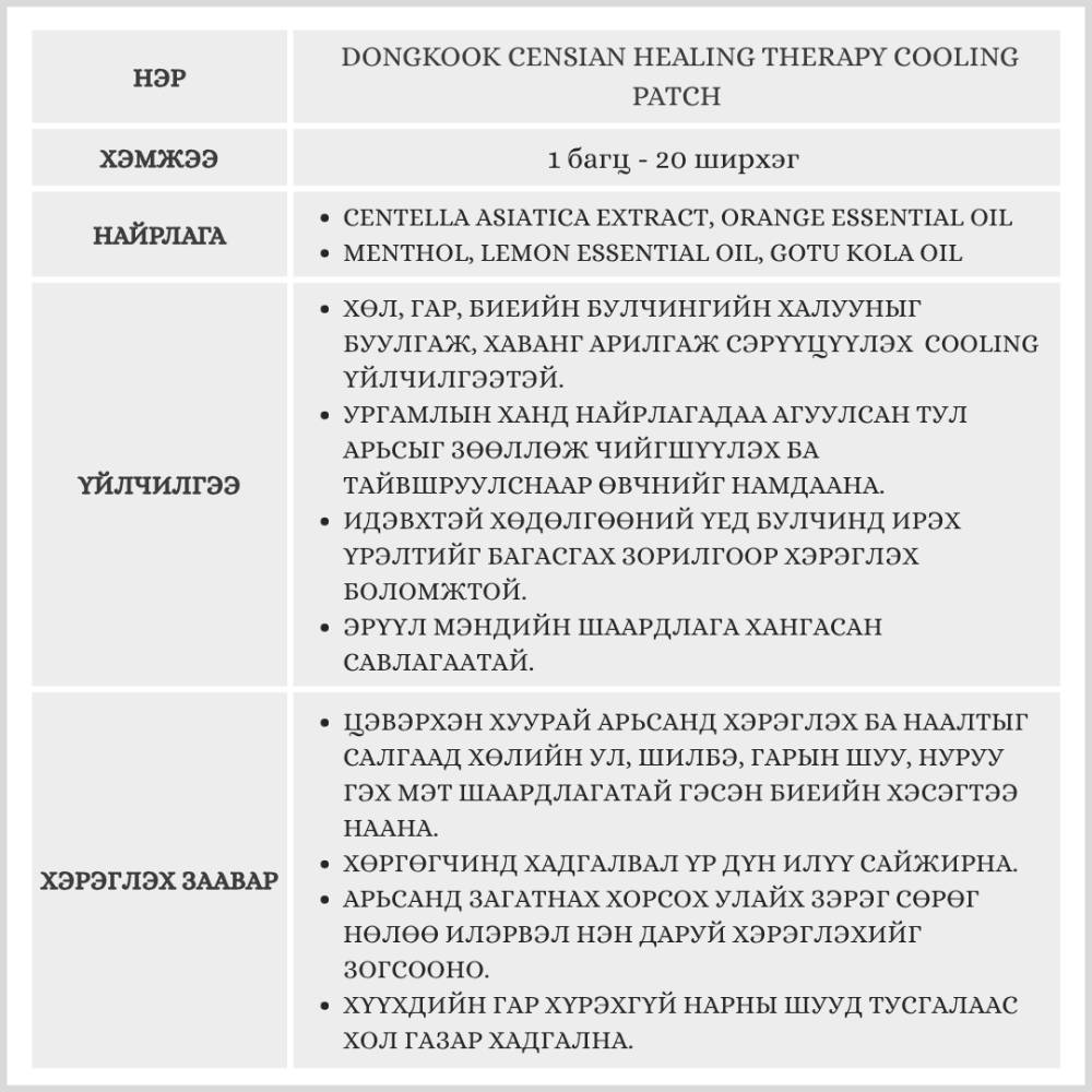 DongKook censian Healing Therapy тайвшруулах наалт нь биеийн булчингийн хаванг болон халууныг буулгаж, сэрүүцүүлэх cooling үйлчилгээтэй. Cica ханд агуулсан тул арьсыг чийгшүүлж, цочролыг багасгана.