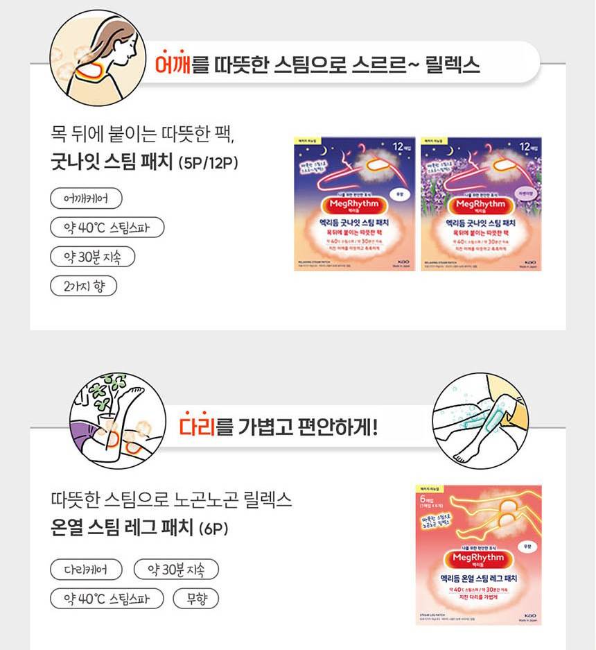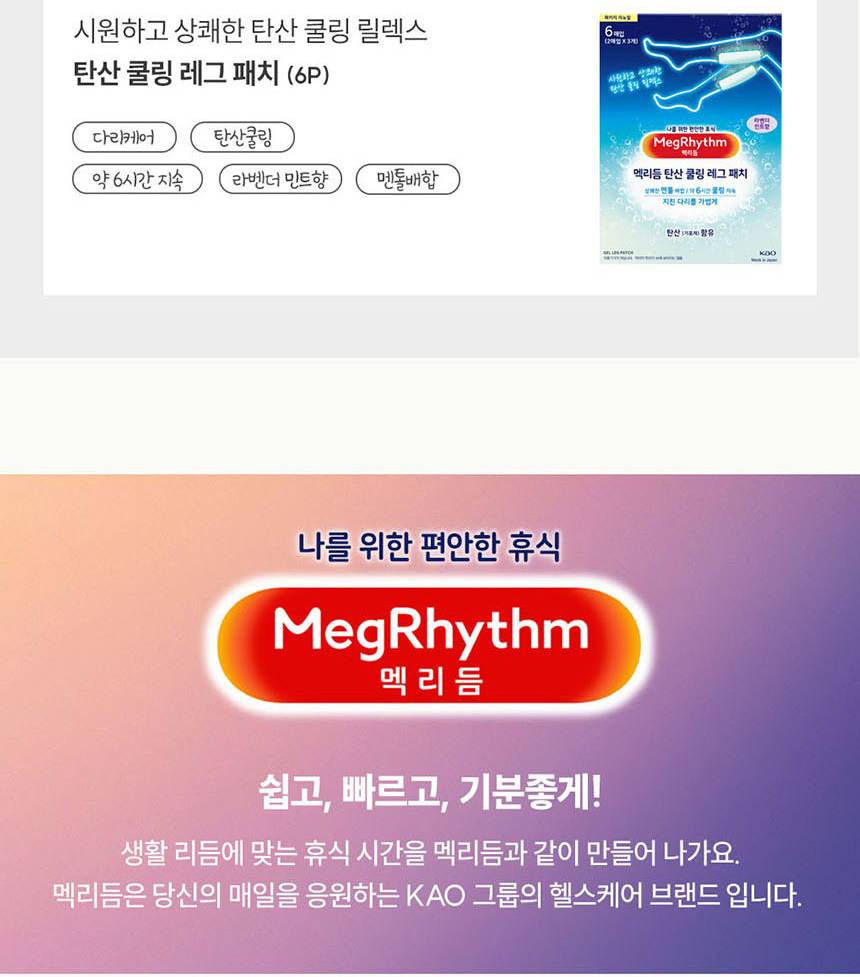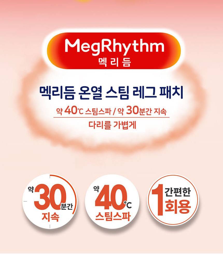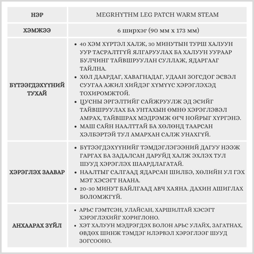 Megurhythm Leg Patch нь хөлийн доод хэсгийн булчинг суллан ядаргааг бууруулж тайвшруулах зориулалттай халуун уурын наалт юм. 40 хэм хүртэл халах ба халуунаа 30 минут хадгална. Мөн хөлийг дулаацуулах зорилгоор хэрэглэх боломжтой.