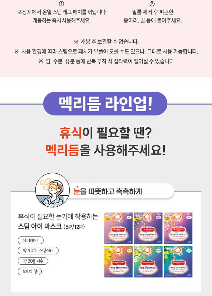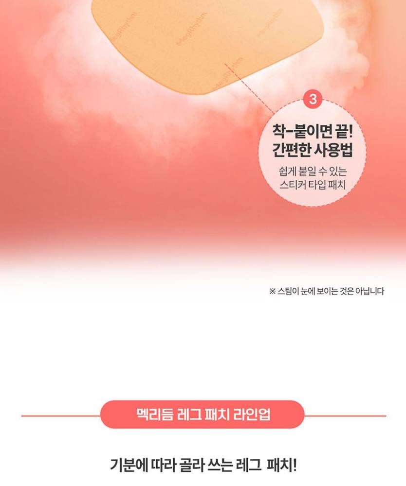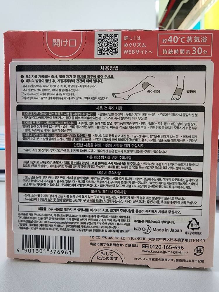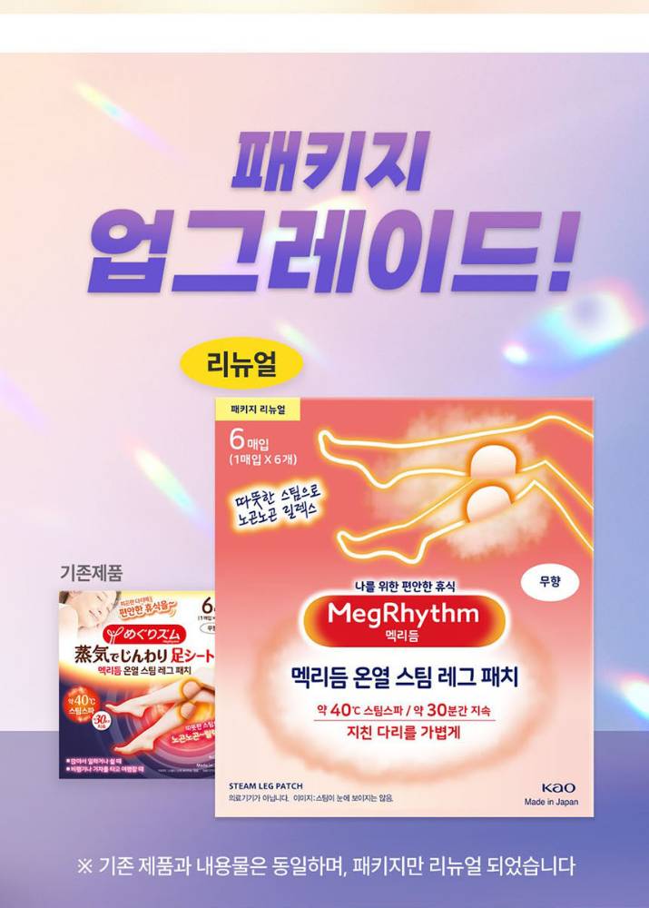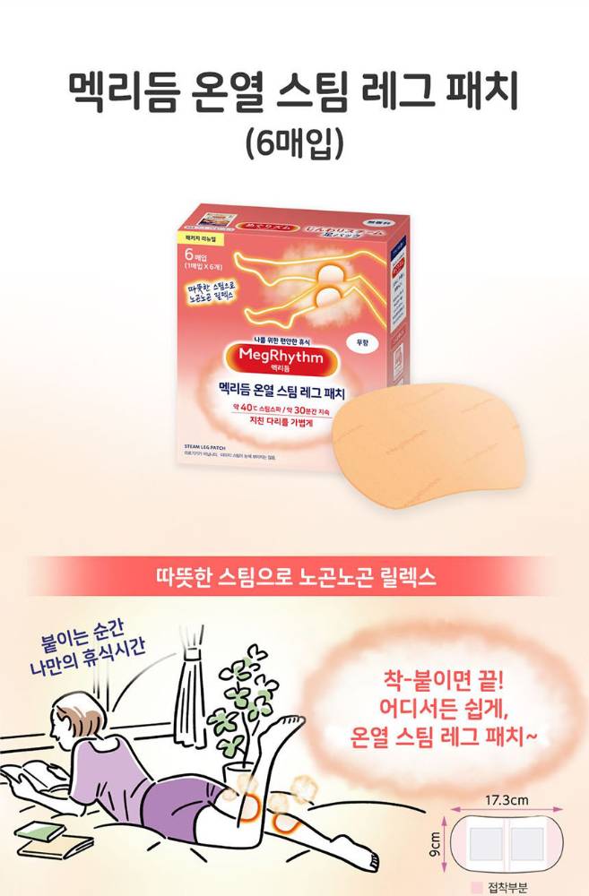 Megurhythm Leg Patch нь хөлийн доод хэсгийн булчинг суллан ядаргааг бууруулж тайвшруулах зориулалттай халуун уурын наалт юм. 40 хэм хүртэл халах ба халуунаа 30 минут хадгална. Мөн хөлийг дулаацуулах зорилгоор хэрэглэх боломжтой.