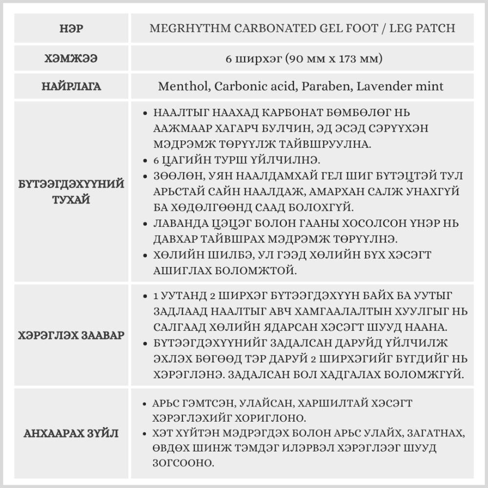 MegRhythm Carbonated Gel Foot / Leg Patch, /Хөлийн cooling наалт/