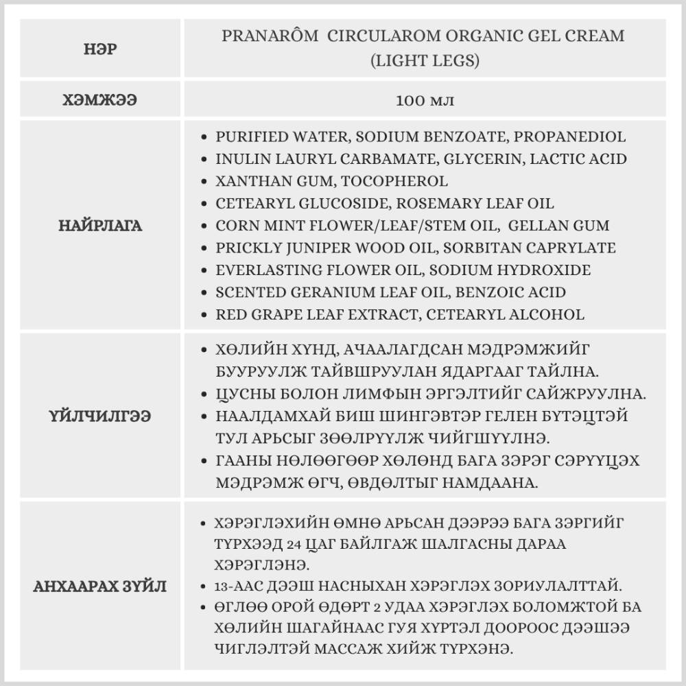 Pranarôm Circularom Organic Gel Cream (Light Legs), 100ml /Хөлийн тайвшруулах тос/