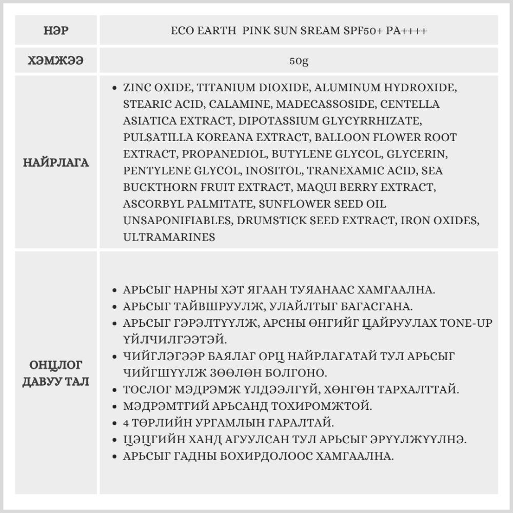 ECO EARTH PINK SUN SREAM SPF50+ PA++++/ DERMA НАРНЫ ТОС/