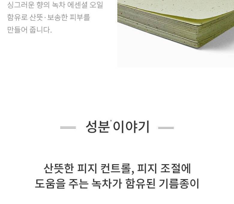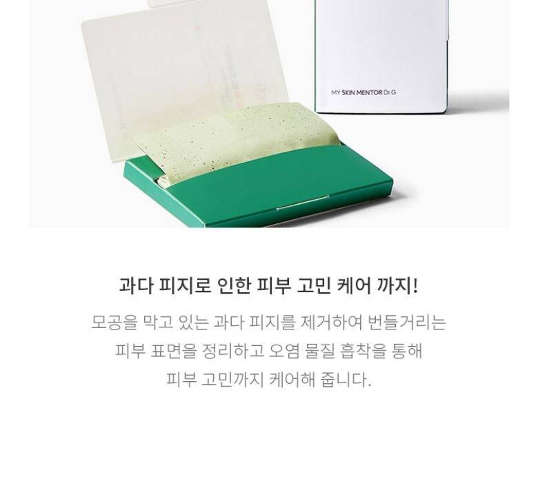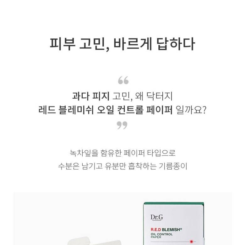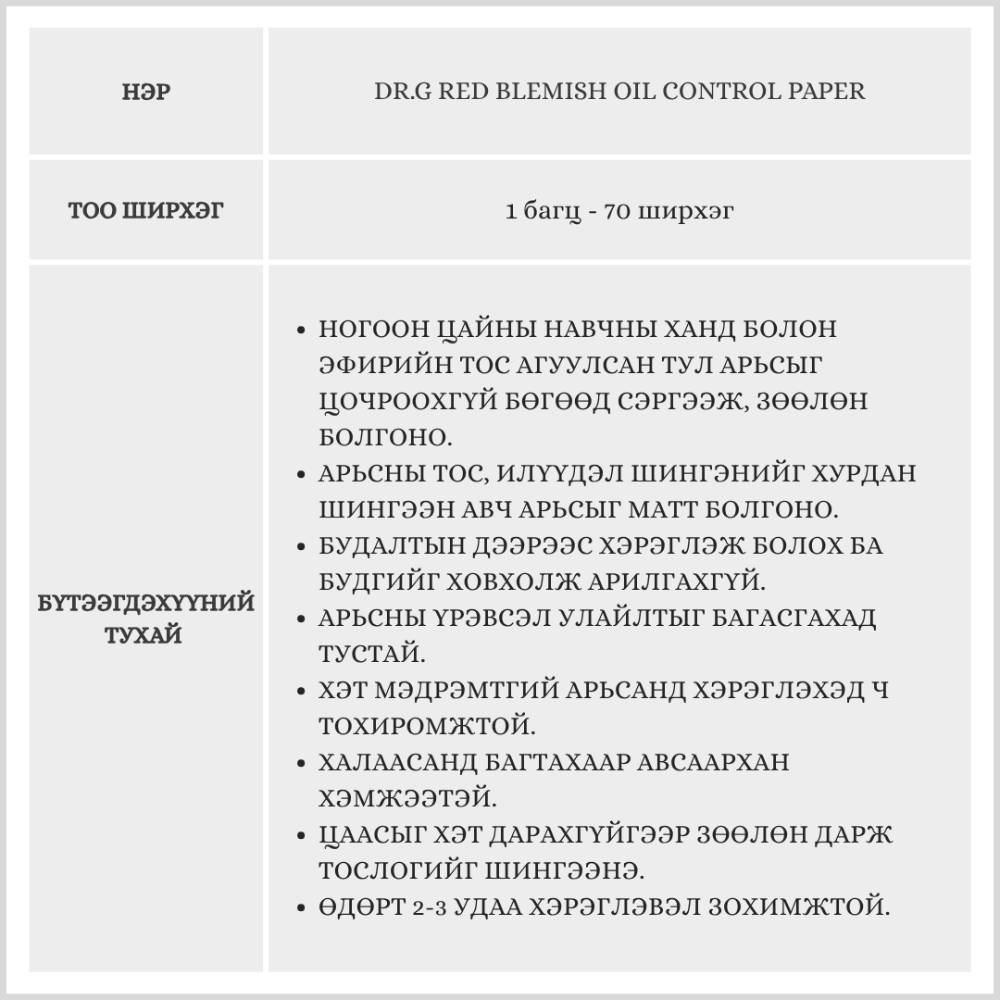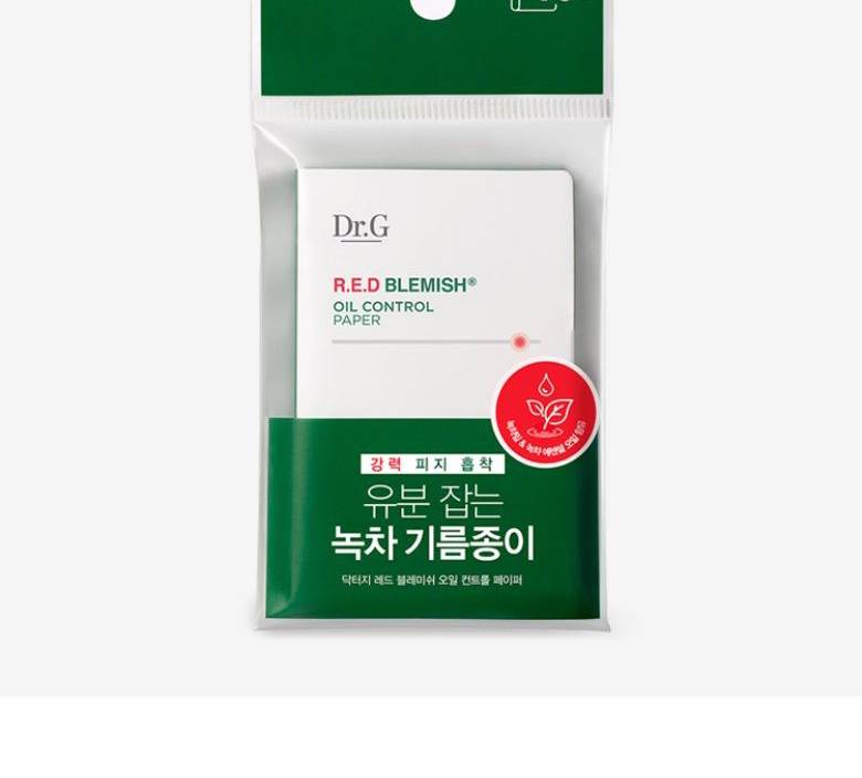 Dr.G Red Blemish Oil Control Paper нь тослог, батгашилттай эсвэл хэт гялалзсан арьстай хүмүүст зориулсан бутарч унахгүй, зөөлөн бүтэцтэй тослог шингээгч цаас юм. Ногоон цайны навчны ханд болон эфирийн тос агуулсан тул арьсыг тайвшруулж, батга гаралтыг бууруулахад тустай.