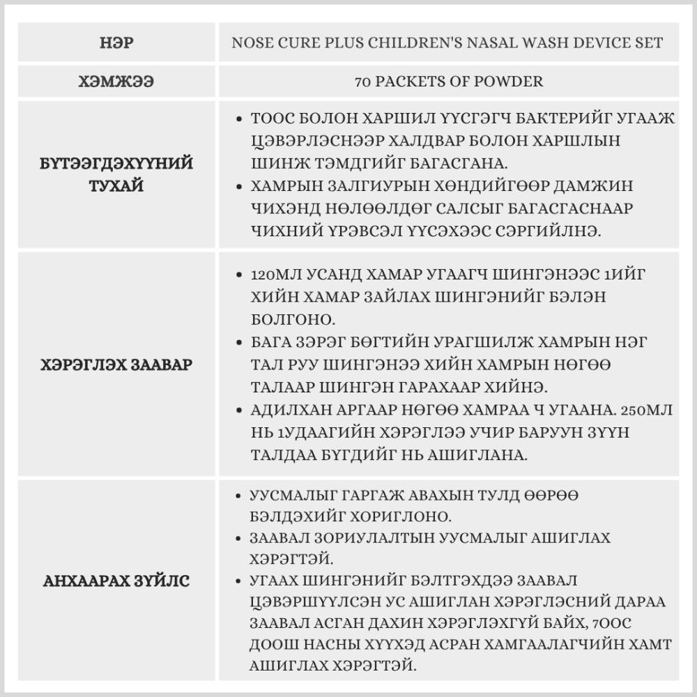Уг хүүхдийн хамар угаагч нь хүүхдийн хамрын хөндийд хуримтлагдсан өтгөн, хатсан зузаан салсыг үр дүнтэй цэвэрлэн хүүхдийн амьсгалах боломжийг бүрдүүлнэ.