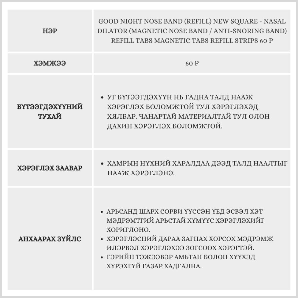 Уг бүтээгдэхүүн нь хамар битүүрэх, хурхирах, эсвэл дасгал хийх үед амьсгалыг сайжруулан бүрэн амьсгалуулах зорилгоор хэрэглэгддэг. 60ширхэг буюу 30хоногийн хэрэглээ.