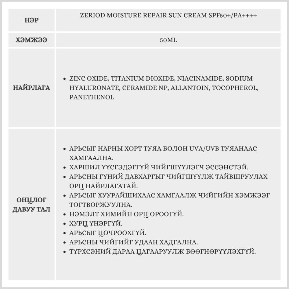 ZERIOD MOISTURE REPAIR SUN CREAM SPF50+/PA++++ / DERMA НАРНЫ ТОС /