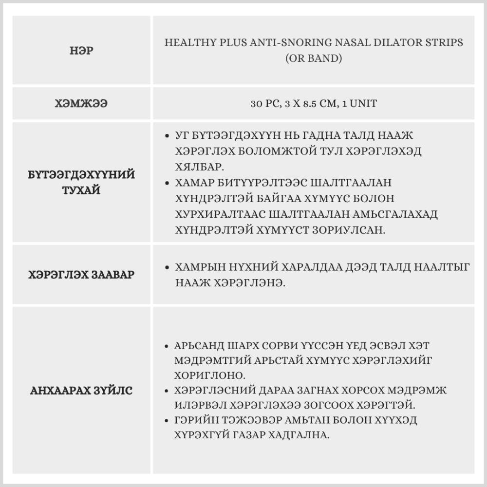 Healthy Plus Anti-Snoring Nasal Dilator Strips (or Band) 30 pc, 3 x 8.5 cm, 1 Unit /Хурхиралтаас сэргийлэх наалт/