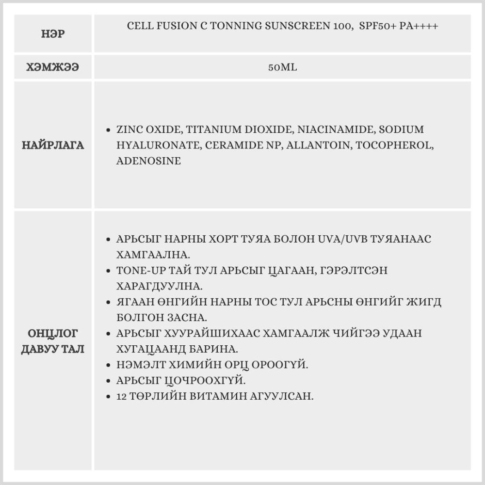 CELL FUSION C TONNING SUNSCREEN 100, SPF50+ PA++++ / DERMA НАРНЫ ТОС/