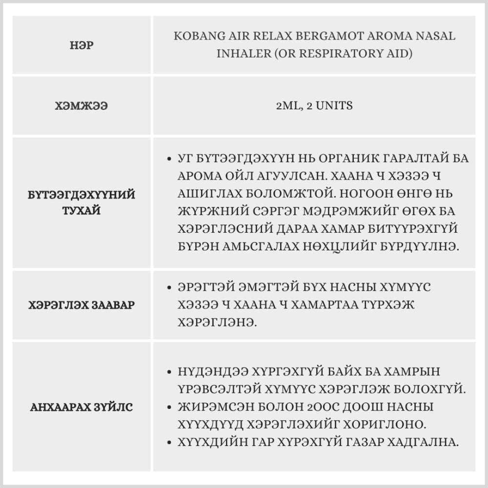 Уг бүтээгдэхүүн нь хамрыг битүүрүүлэхгүй сэргээж өгөх ба түрхсэн үед гааны сэргэг мэдрэмжийг авна. Органик байгалийн гаралтай ба арома ойл агуулсан түрхлэг.