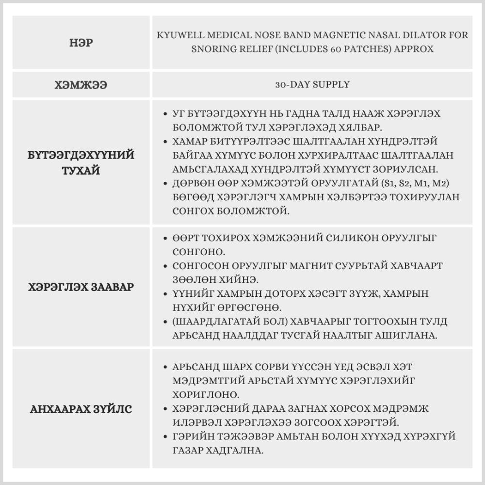 Kyuwell Medical Nose Band Magnetic Nasal Dilator for Snoring Relief (Includes 60 Patches) Approx. 30-Day Supply /Хурхиралтаас сэргийлэх наалт/