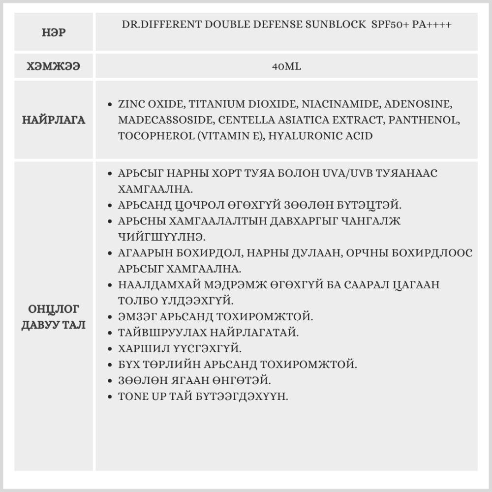 DR.DIFFERENT DOUBLE DEFENSE SUNBLOCK SPF50+ PA++++ /DERMA НАРНЫ ТОС/