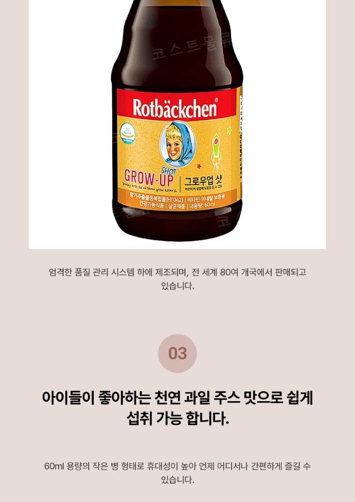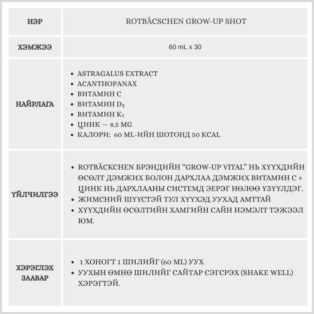 Rotbäckchen брэндийн “Grow-Up Vital” нь Хүүхдийн өсөлт дэмжих болон Дархлаа дэмжих Витамин C + цинк нь дархлааны системд эерэг нөлөө үзүүлдэг. Жимсний шүүстэй тул хүүхэд уухад амттай, Хүүхдийн өсөлтийн хамгийн сайн нэмэлт тэжээл юм.
