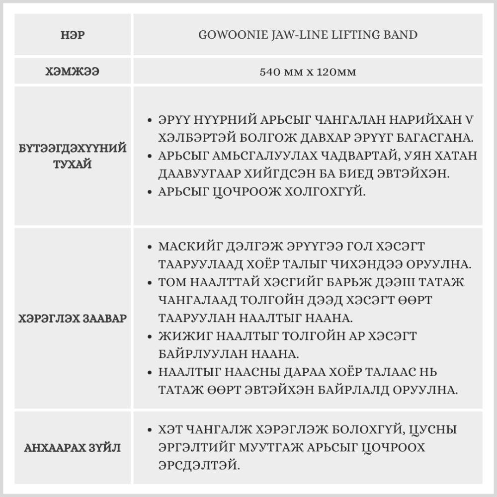 GOWOONIE Jaw-Line Lifting Band, 1ш /Нүүрийг V хэлбэрт оруулах маск/