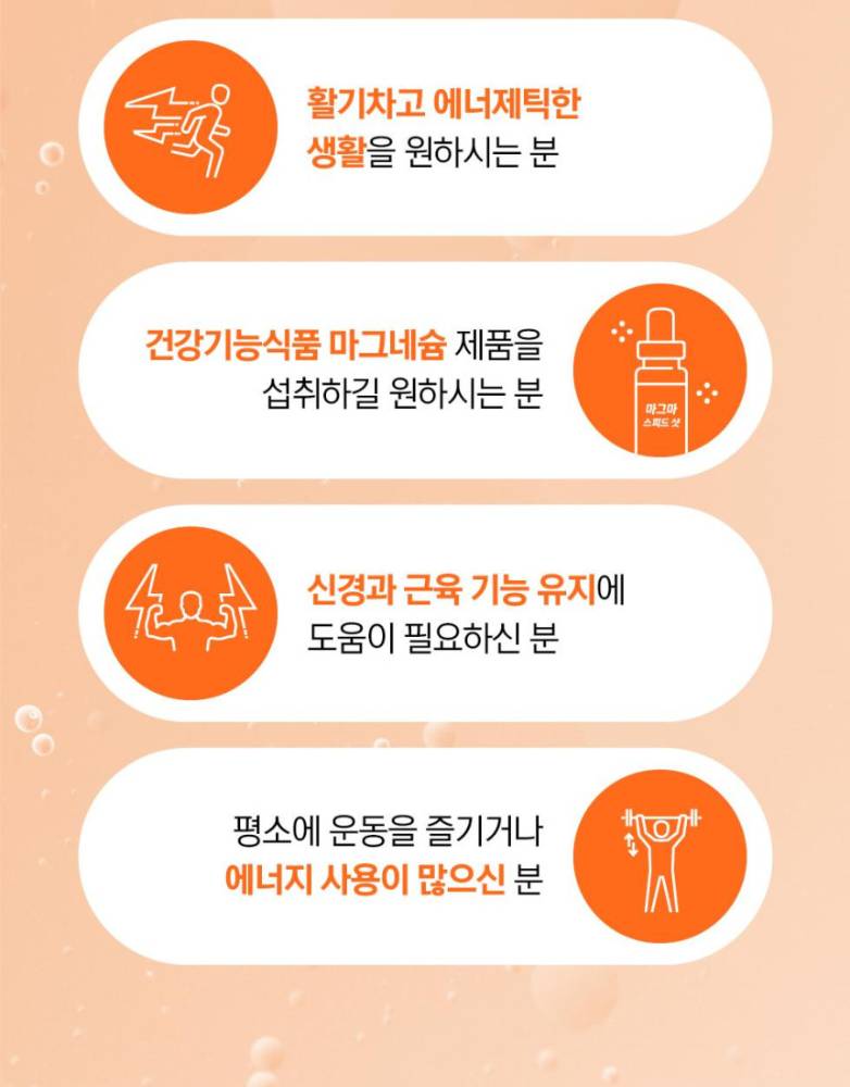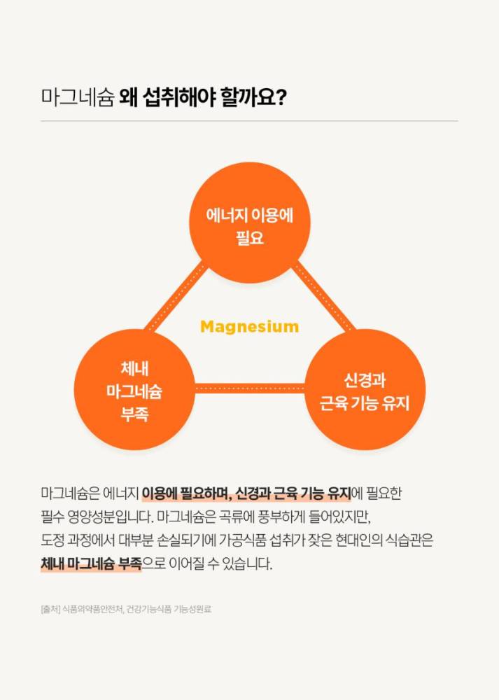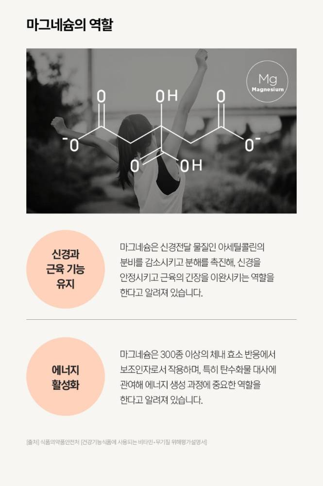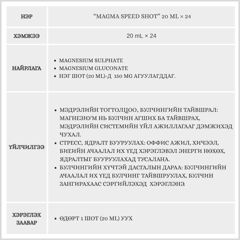 Магнезиум нь булчин чангарах ба тайвшрах, мэдрэлийн системийн үйл ажиллагааг дэмжихэд чухал нөлөөтэй. Оффис ажил, хичээл, биеийн ачаалал их үед хэрэглэвэл энерги нөхөх, ядралтыг бууруулахад тусалана. Булчингийн ачаалал их үед булчинг тайвшруулах, булчин зангирахаас сэргийлэхэд хэрэглэнэ.