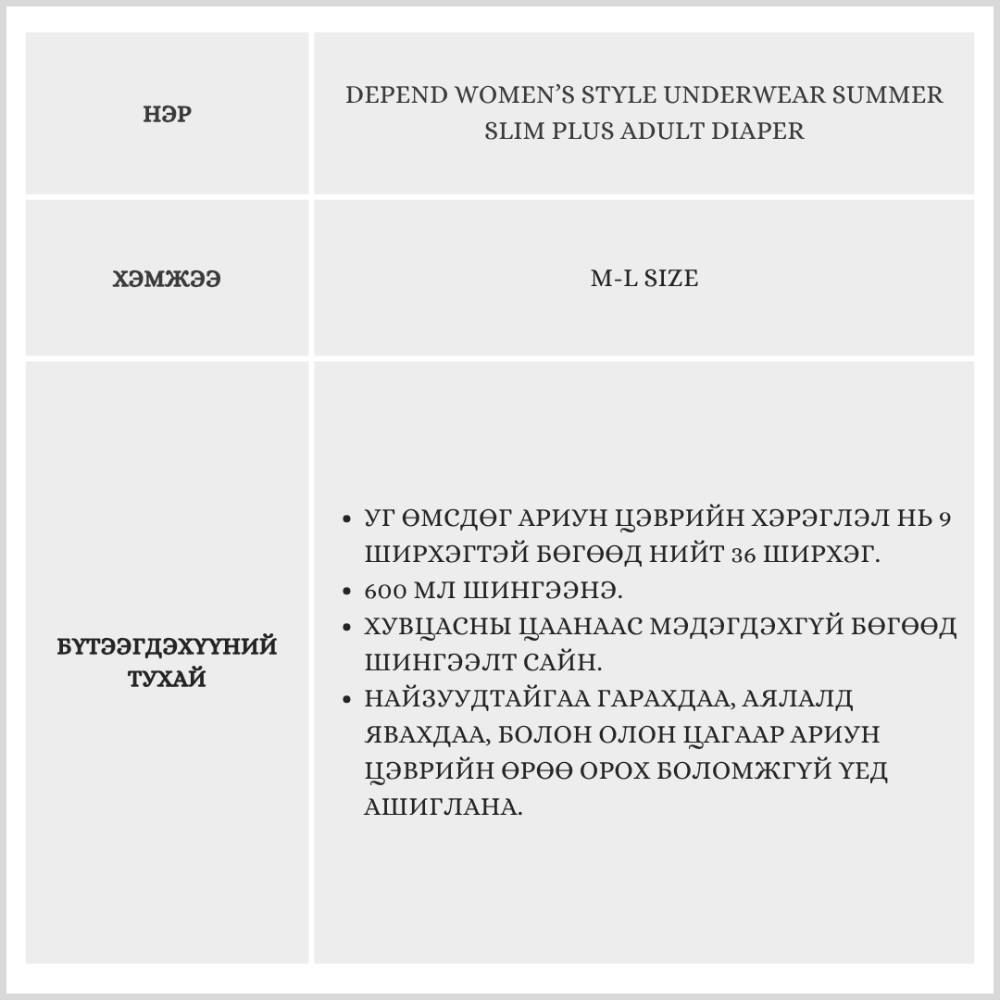 Depend Women’s Style Underwear Summer Slim Plus Adult Diaper /Өмсдөг ариун цэврийн хэрэглэл/