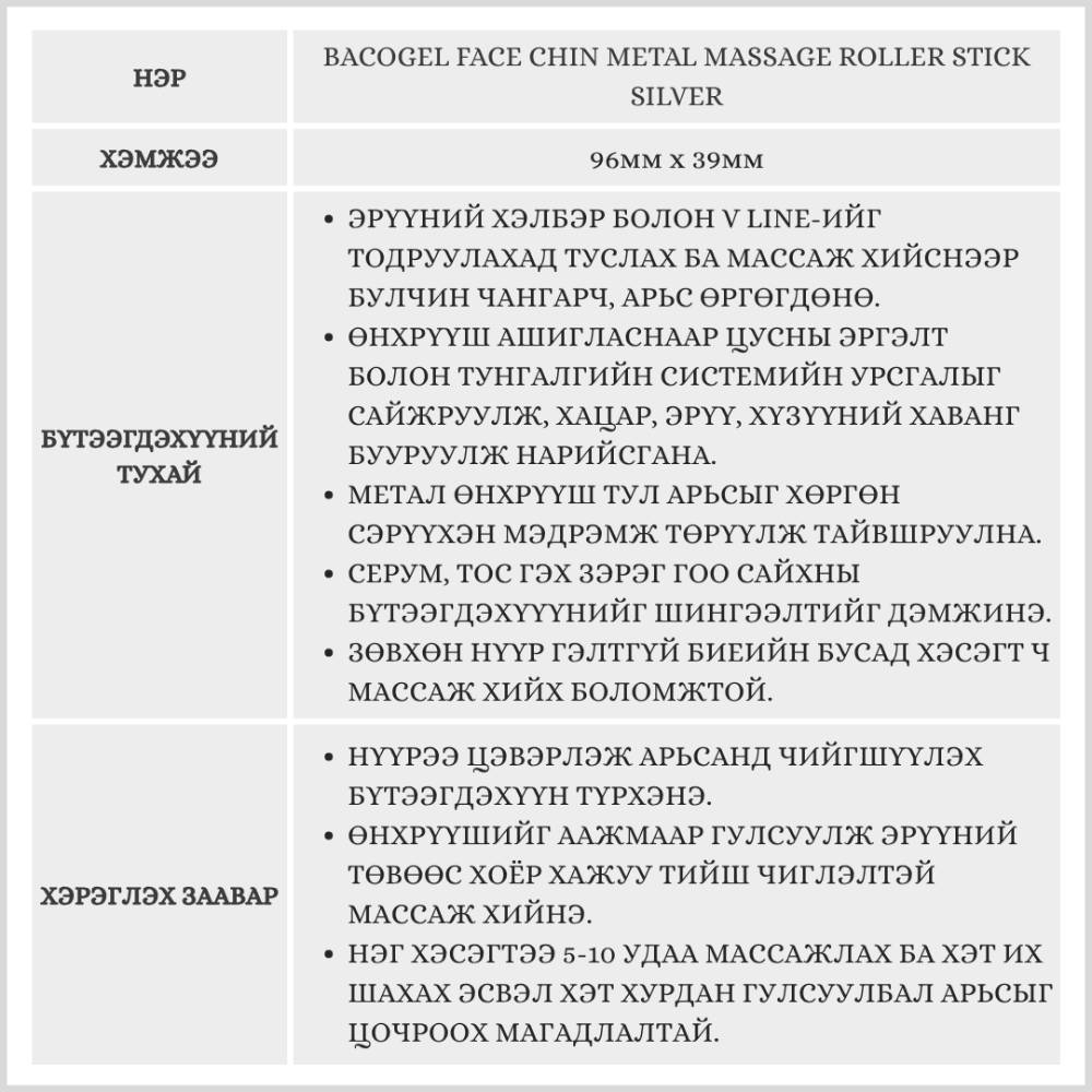 Bacogel Face Chin Metal Massage Roller Stick Silver, 1ш /Нүүрний хэлбэр засах метал өнхрүүш/