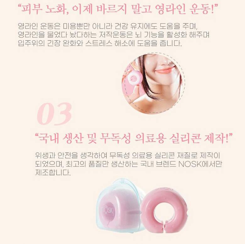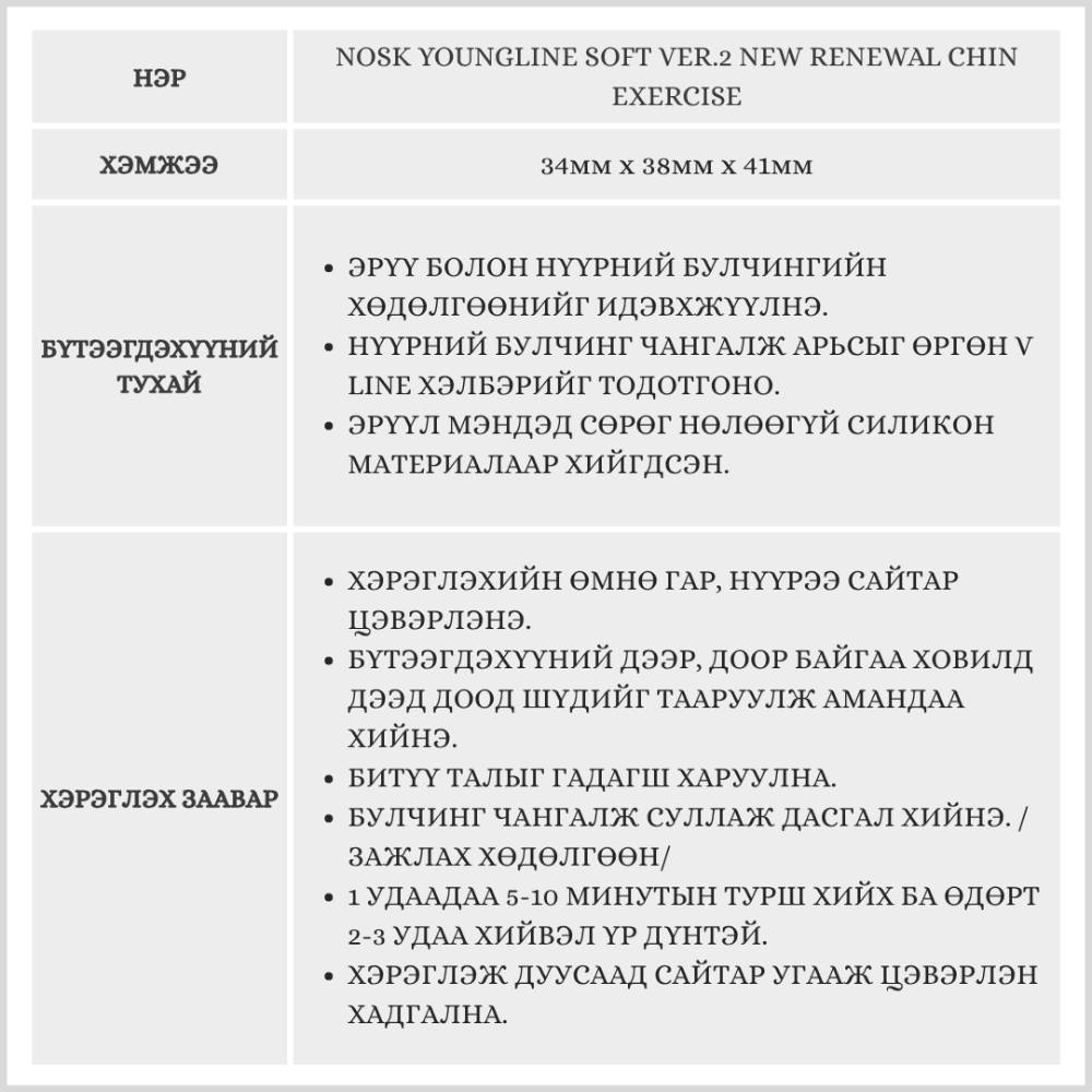 Nosk Youngline Soft ver.2 New Renewal Chin Exercise бүтээгдэхүүн нь амандаа хийж зажлах хөдөлгөөнөөр эрүү нүүрний булчинг ажиллуулдаг дасгалын хэрэгсэл юм. Тогтмол хэрэглэснээр нүүр нарийсаж V line хэлбэрийг тодруулна.