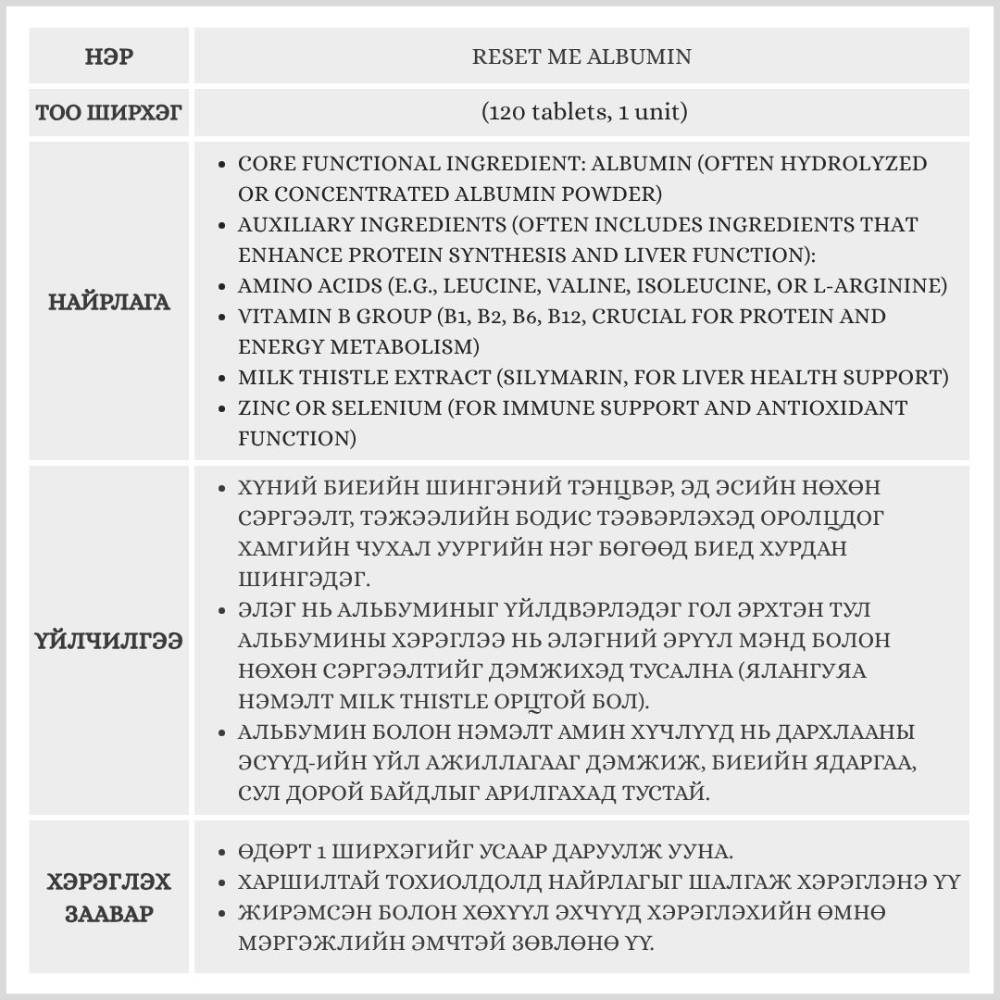 Reset Me Albumin 120 tablets, 1 unit(нэмэлт тэжээл)