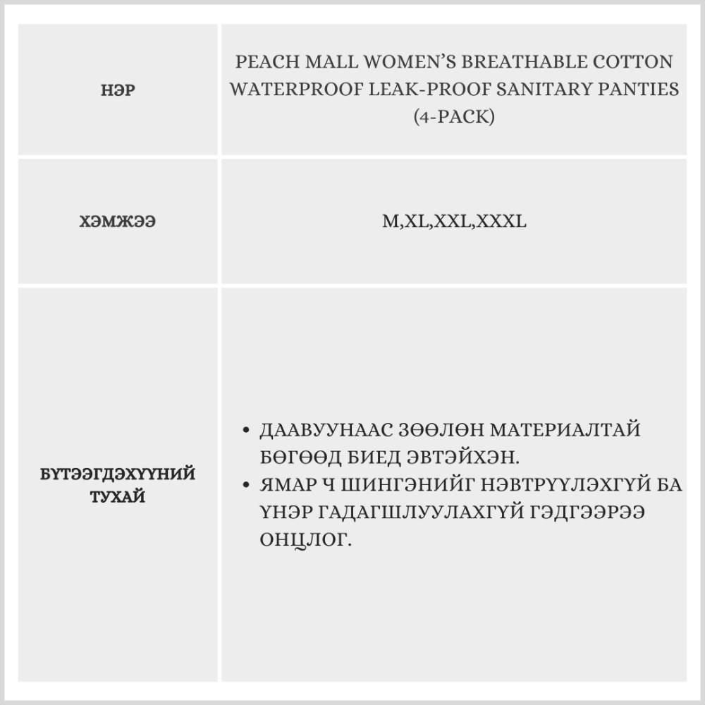 Peach Mall Women’s Breathable Cotton Waterproof Leak-Proof Sanitary Panties (4-Pack) /Сарын тэмдгийн дотуур хувцас/