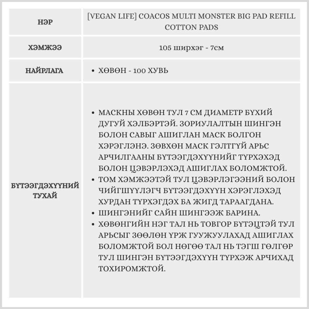 [Vegan Life] Coacos Multi Monster Big Pad Refill Cotton Pads, 105ш (2 багц) /Маскны хөвөн/