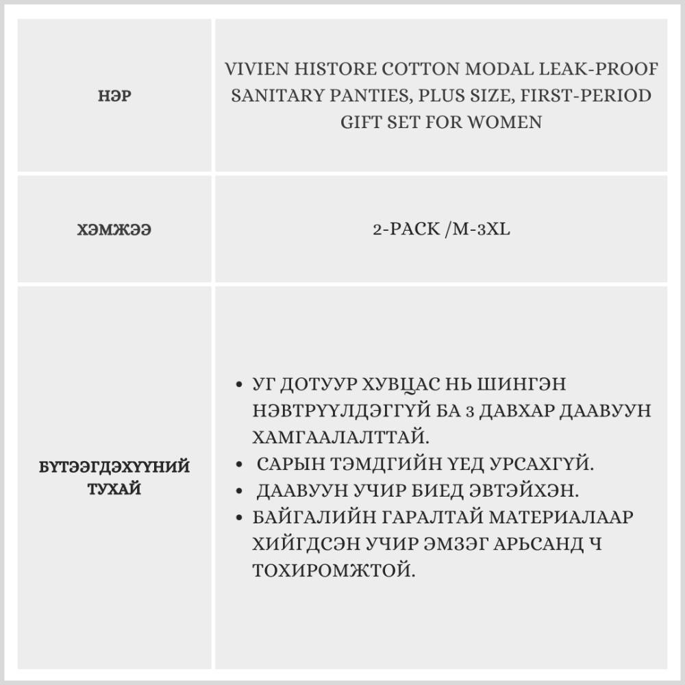 VIVIEN Histore Cotton Modal Leak-Proof Sanitary Panties, Plus Size, First-Period Gift Set for Women – 2-Pack /Сарын тэмдгийн дотуур хувцас/