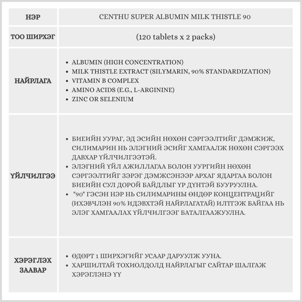 Centhu Super Albumin Milk Thistle 90 120 tablets x 2 packs (элэгний нэмэлт тэжээл)