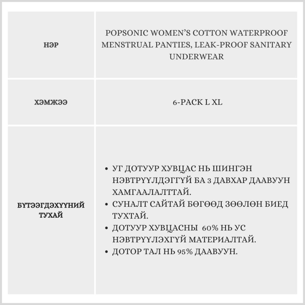POPSONIC Women’s Cotton Waterproof Menstrual Panties, Leak-Proof Sanitary Underwear – 6-Pack /Сарын тэмдгийн дотуур хувцас/