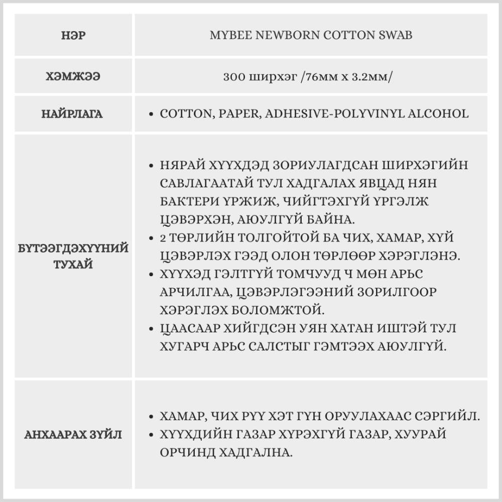 MYBEE Newborn Cotton Swab, 300ш /Чихний хөвөн/