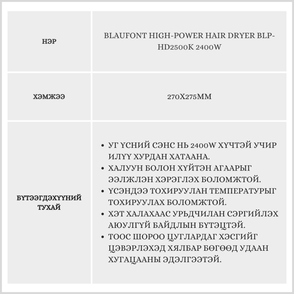 Blaufont High-Power Hair Dryer BLP-HD2500K 2400W /Үсний сэнс/