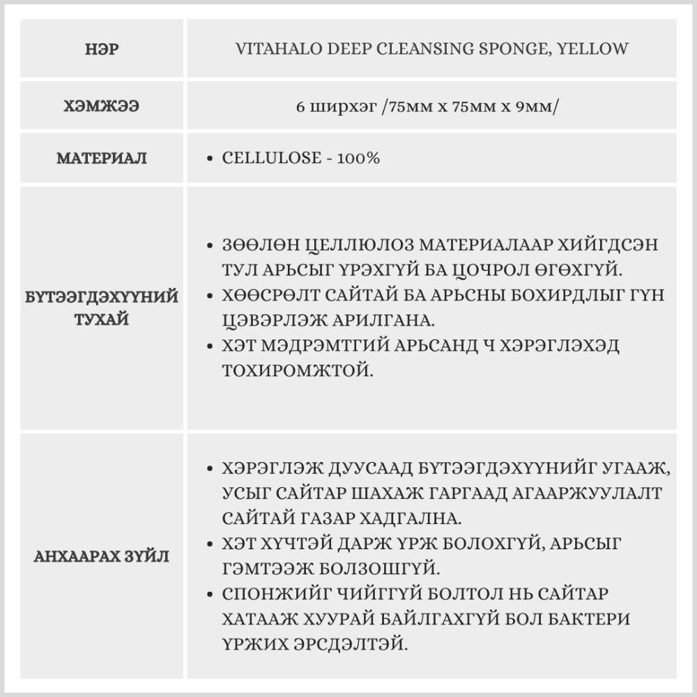 Vitahalo брэндийн нүүрний арьсыг гүн цэвэрлэж, бохирдлыг бүрэн арилгах зориулалттай, зөөлөн бүтэцтэй спонж. Мэдрэмтгий арьсанд хэрэглэхэд ч тохиромжтой.