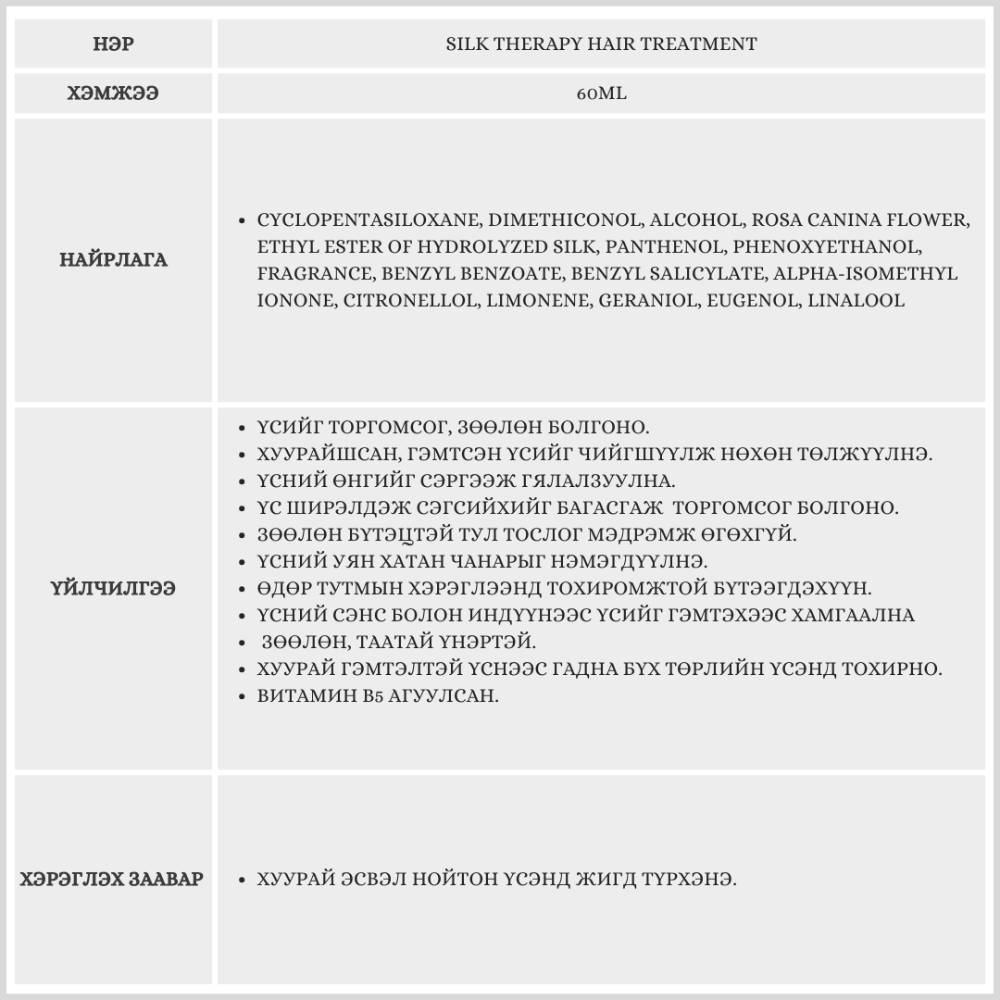 SILK THERAPY HAIR TREATMENT / ҮСНИЙ ТЭЖЭЭЛ /