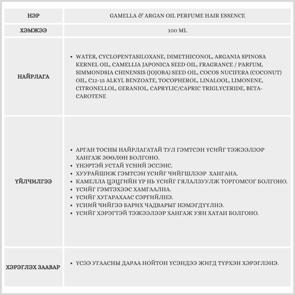 GAMELLA & ARGAN OIL PERFUME HAIR ESSENCE / ҮСНИЙ ТЭЖЭЭЛ /