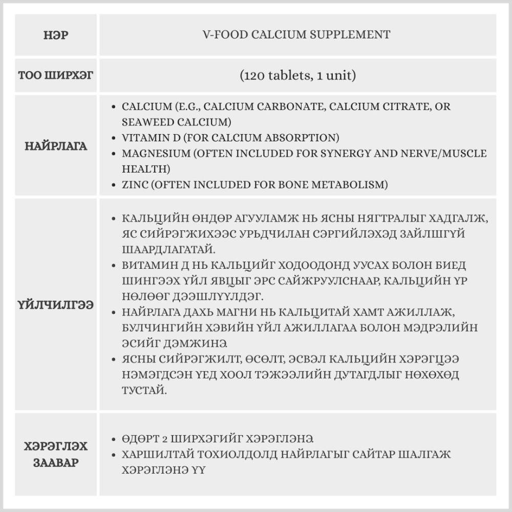 Хүний биеийн яс, шүд, болон мэдрэл, булчингийн үйл ажиллагаанд чухал үүрэгтэй Кальцийн дутагдлыг нөхөх зорилготой нэмэлт тэжээл юм.