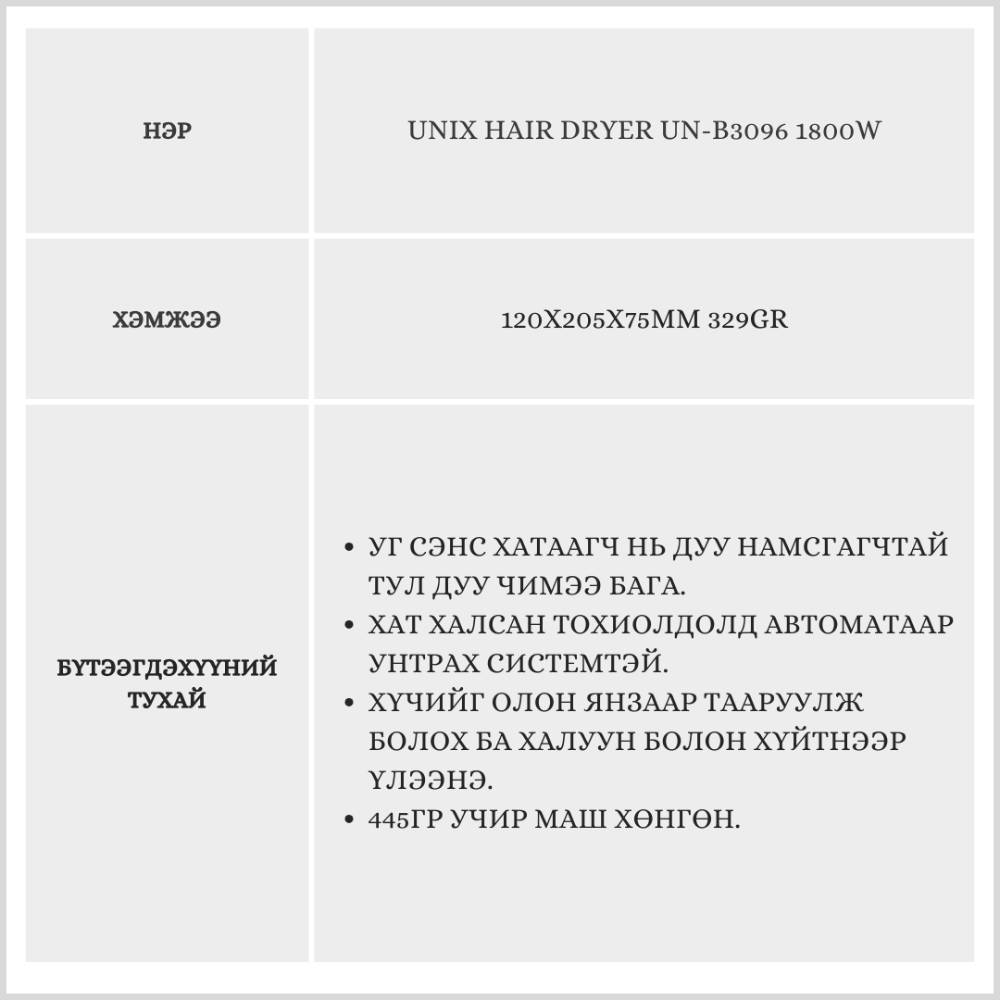 Unix Hair Dryer UN-B3096 1800W /Үсний сэнс/