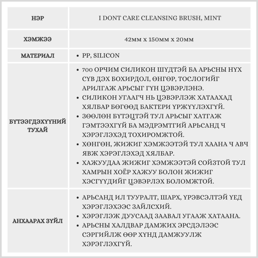 I DONT CARE Cleansing Brush нь зөөлөн силикон материалаар хийгдсэн нүүр угаагч сойз юм. Арьсны тослог, бохирдлыг үр дүнтэй цэвэрлэнэ. Нүүр цэвэрлэгч түрхээд зөөлөн иллэг хийх замаар нүүрээ угаах ба ашигласны дараа бүтээгдэхүүнийг сайтар угааж, хатаах шаардлагатай.